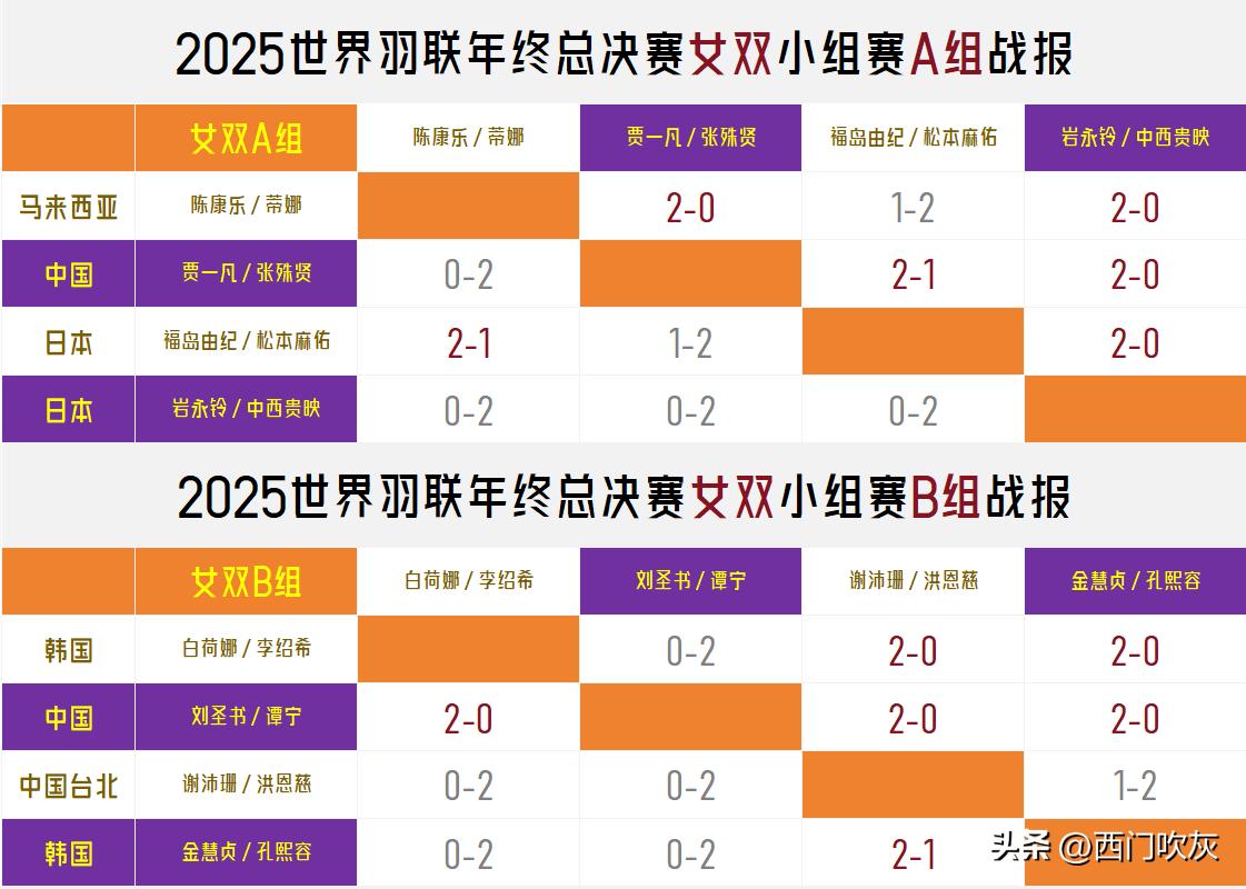 【羽联年终总决赛女双四强落位!刘圣书谭宁三连胜晋级,贾一凡张殊贤两胜一负出局!】 2025世界羽联年终总决赛女双四强全部产生。 A组:马来西亚组合陈康乐/蒂娜、日本组合福岛由纪/松本麻佑。 B组:中国组合刘圣书/谭宁、韩国组合白荷娜/李绍希。 贾一凡/张殊贤太可惜!小分惜败出局!