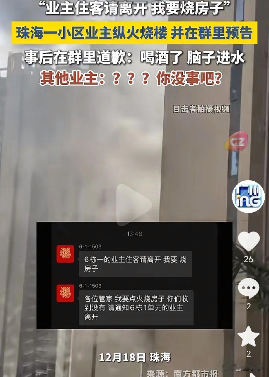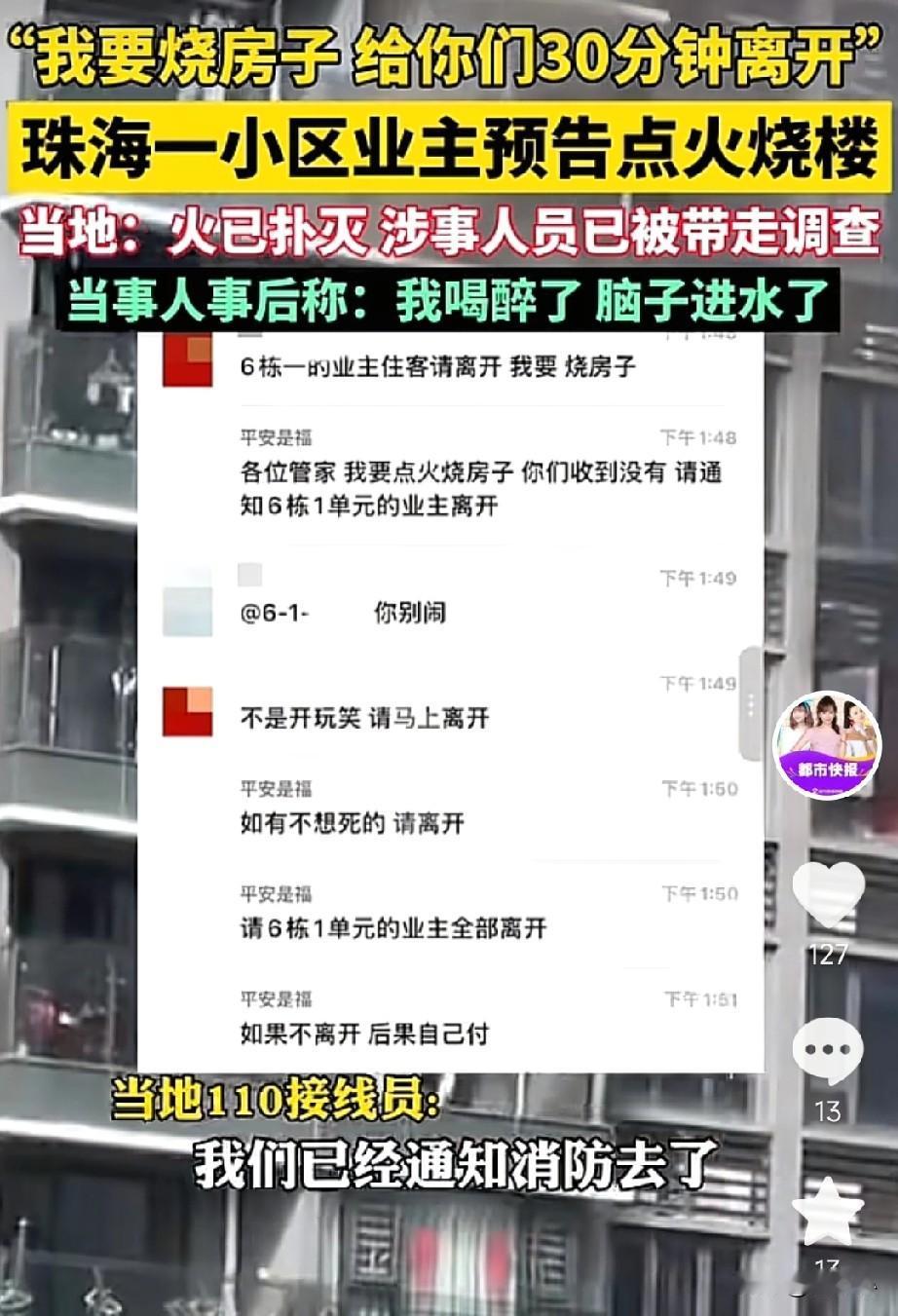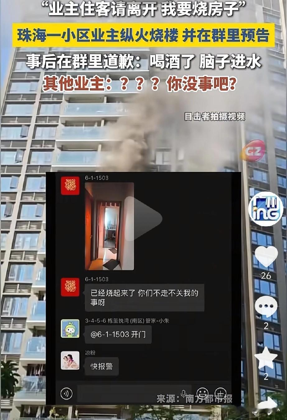 这人还怪好的嘞!做坏事先通报一下。 珠海,一业主在群里呐喊,“业主住客请离开,我要开始烧房子了”,真的是哭笑不得, 你说他正常吧!他放火烧房子,你说他不正常吧!他还提前通知让别人撤离。 “各位管家,我要点火烧房子了,请马上离开”,群里突然来了一句这样的话,有人认为是开玩笑,但发信息的人却回复,不是玩笑,还又说了一遍,请快速离开。 随后,又把自家房子着火的视频发到群里,这才引起了大家的重视,这不是玩笑,是真的。 群里瞬间热闹了起来,有人在群里快速说道,快报警啊! 不过好在消防人员很快到达现场,将明火给扑灭了,没有造成人员伤亡。 让人最难以置信的是,事后,该业主在群里向大家道歉,并且也说出了当时,自己是喝酒喝多了,脑子进水了。 你说他人不行吧!他还怪好勒,还知道通知其他人撤离,你说他好吧,他却烧房子连累无辜邻居。 最搞笑的是那个在群里说“快报警”的邻居,她自己拿着手机不报警,在群里喊别人报警[笑哭] 不过好在并没有造成严重事态。