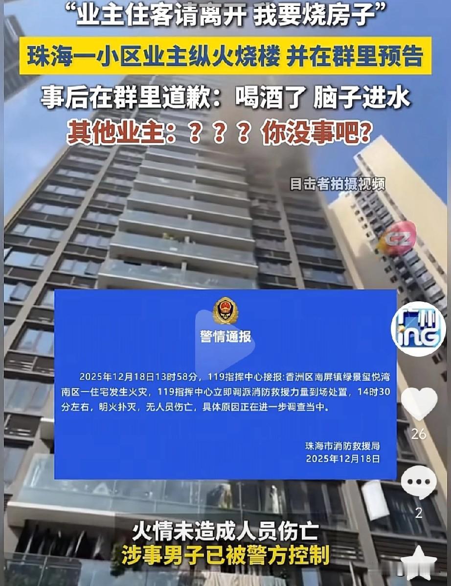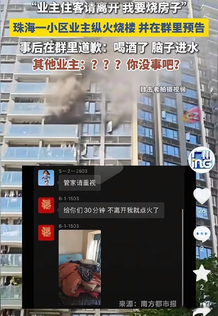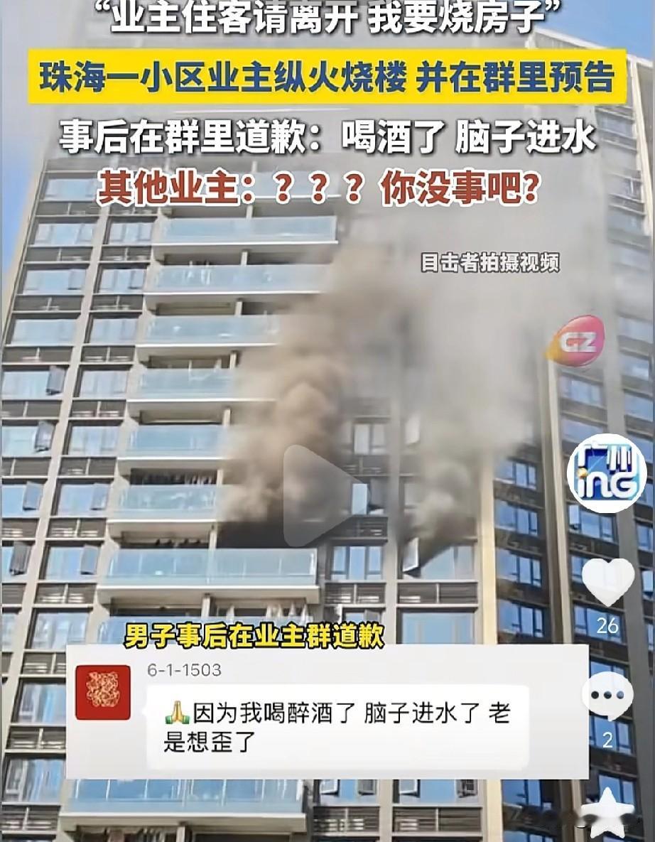 这人还怪好的嘞!做坏事先通报一下。 珠海,一业主在群里呐喊,“业主住客请离开,我要开始烧房子了”,真的是哭笑不得, 你说他正常吧!他放火烧房子,你说他不正常吧!他还提前通知让别人撤离。 “各位管家,我要点火烧房子了,请马上离开”,群里突然来了一句这样的话,有人认为是开玩笑,但发信息的人却回复,不是玩笑,还又说了一遍,请快速离开。 随后,又把自家房子着火的视频发到群里,这才引起了大家的重视,这不是玩笑,是真的。 群里瞬间热闹了起来,有人在群里快速说道,快报警啊! 不过好在消防人员很快到达现场,将明火给扑灭了,没有造成人员伤亡。 让人最难以置信的是,事后,该业主在群里向大家道歉,并且也说出了当时,自己是喝酒喝多了,脑子进水了。 你说他人不行吧!他还怪好勒,还知道通知其他人撤离,你说他好吧,他却烧房子连累无辜邻居。 最搞笑的是那个在群里说“快报警”的邻居,她自己拿着手机不报警,在群里喊别人报警[笑哭] 不过好在并没有造成严重事态。