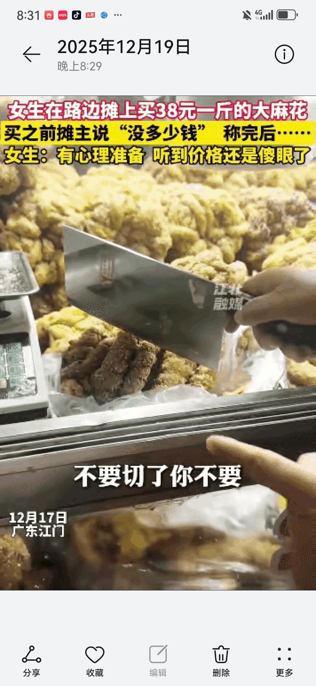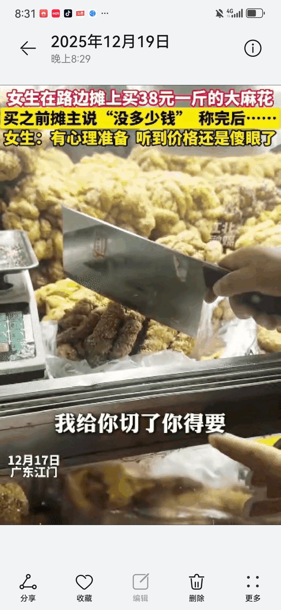 “能不能别宰我!”广东一女生路边摊买大麻花,标价38/斤,摊主切了一大块,女子有心理准备,觉得顶多六七十吧,摊主也说:“没多少钱”,结果,称完之后,竟然有4斤多,需要支付160元,女生吐槽,遇到麻花刺客,下次再也不敢买了。 广东女生的遭遇真不是个例,这哪是买小吃,分明是被“套路刺客”盯上了! 别觉得摊主只是手起刀落切得多,这背后全是算好的坑。故意只报单价不提麻花压秤的特点,利用大家对“斤两”的模糊认知,再用“切了就得要”的霸王条款锁死退路,本质就是钻了信息差的空子。 更气人的是,这种“强买强卖”压根不合法,《消费者权益保护法》早明确了消费者有自主选择权,摊主没资格强迫买单。真遇到这种情况,别不好意思,直接说“不买”并投诉,保留付款记录和现场视频就行。 其实防坑超简单,要么直接说“只买20块钱的”锁死金额,要么要求先称后切,遇到坚持“切了必须买”的直接走。你有没有被路边摊坑过?评论区分享下你的避坑经验! 路边摊买麻花切完要付160