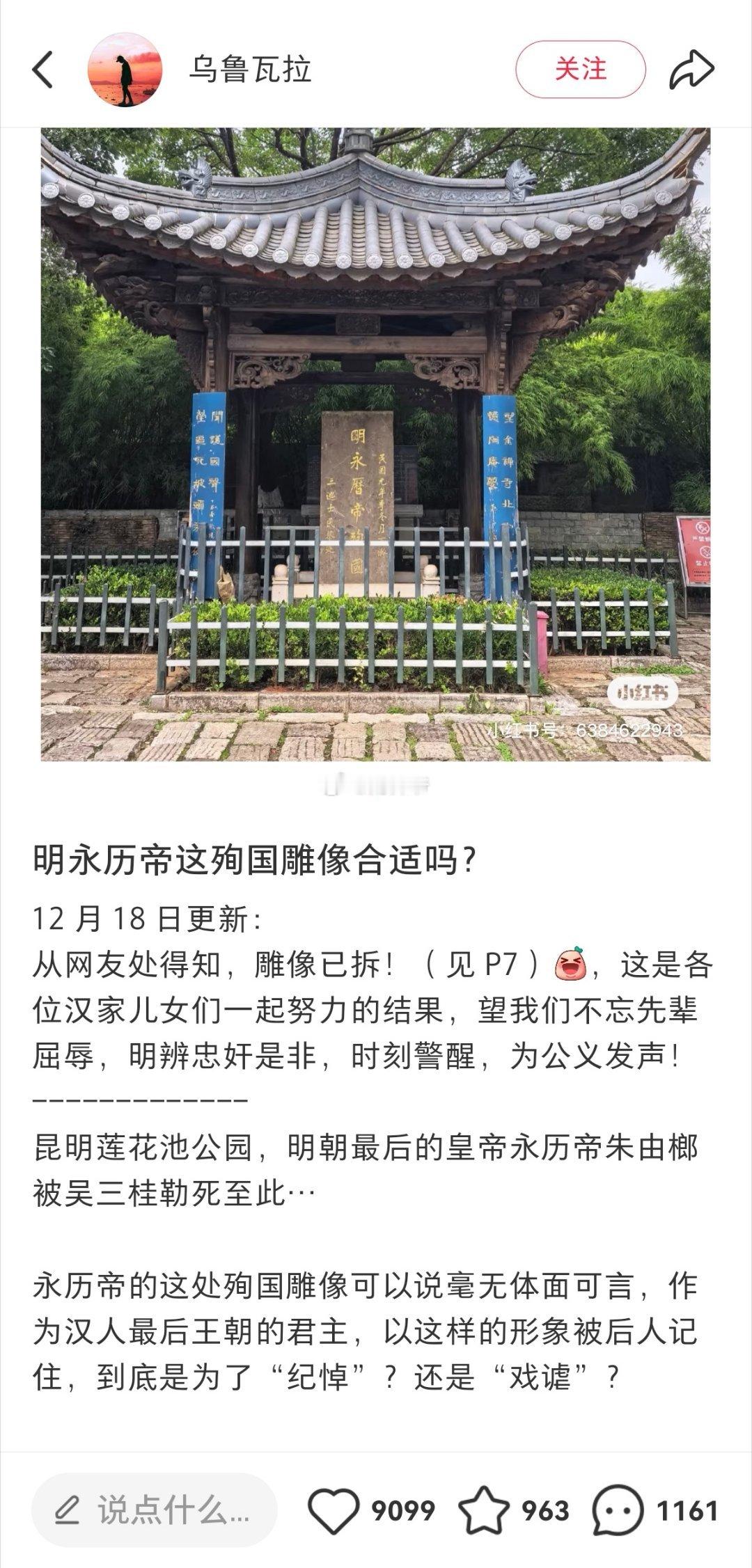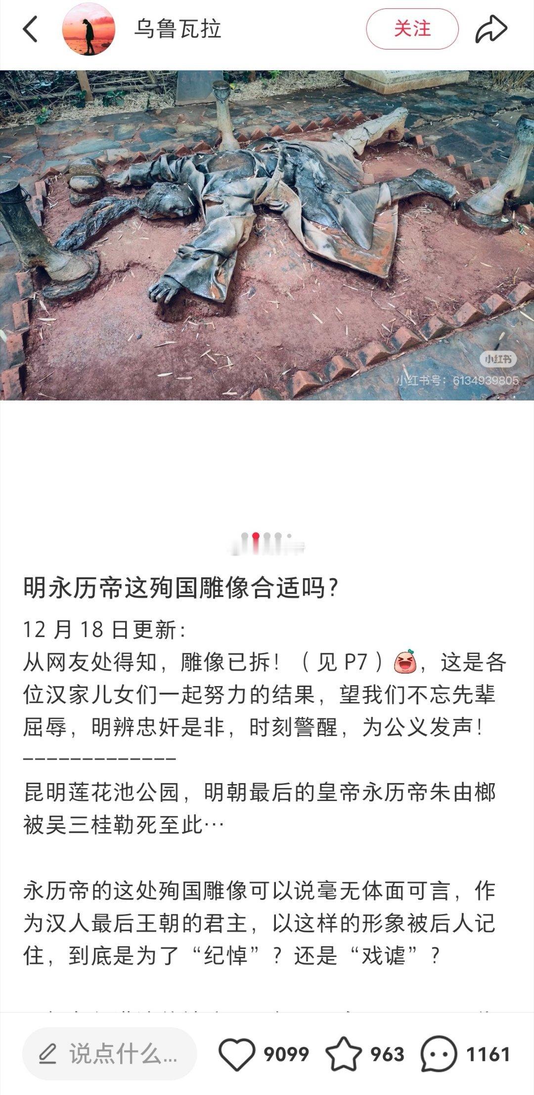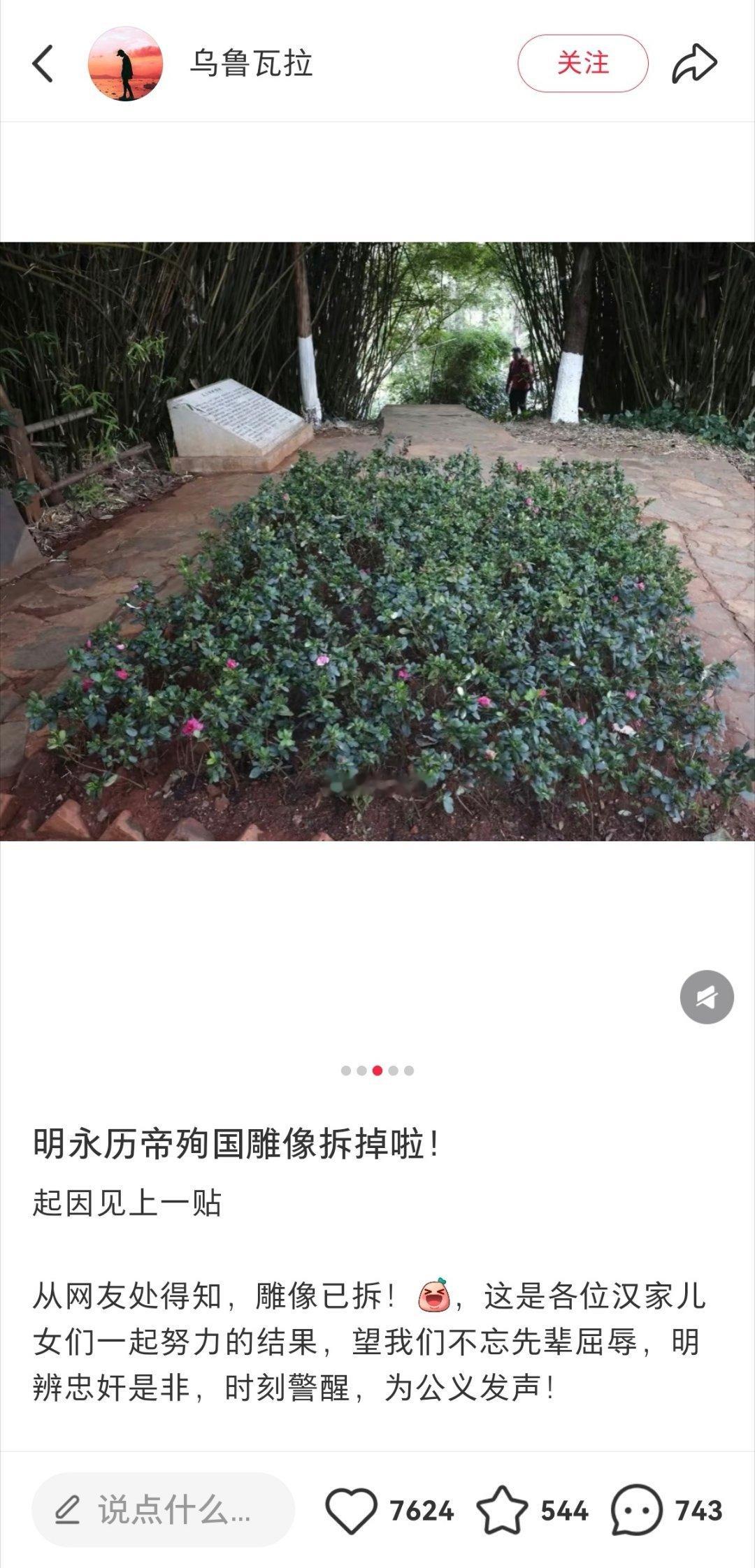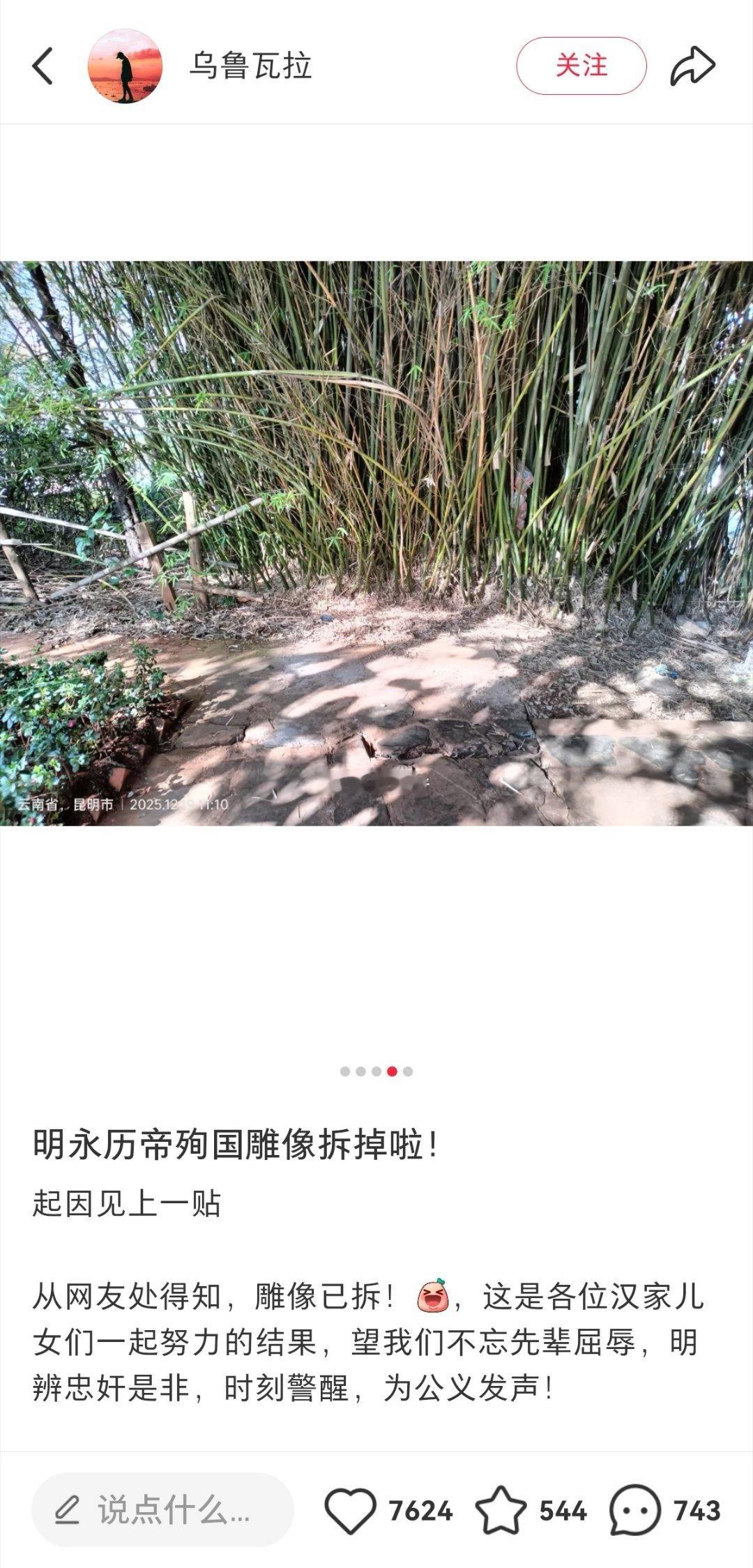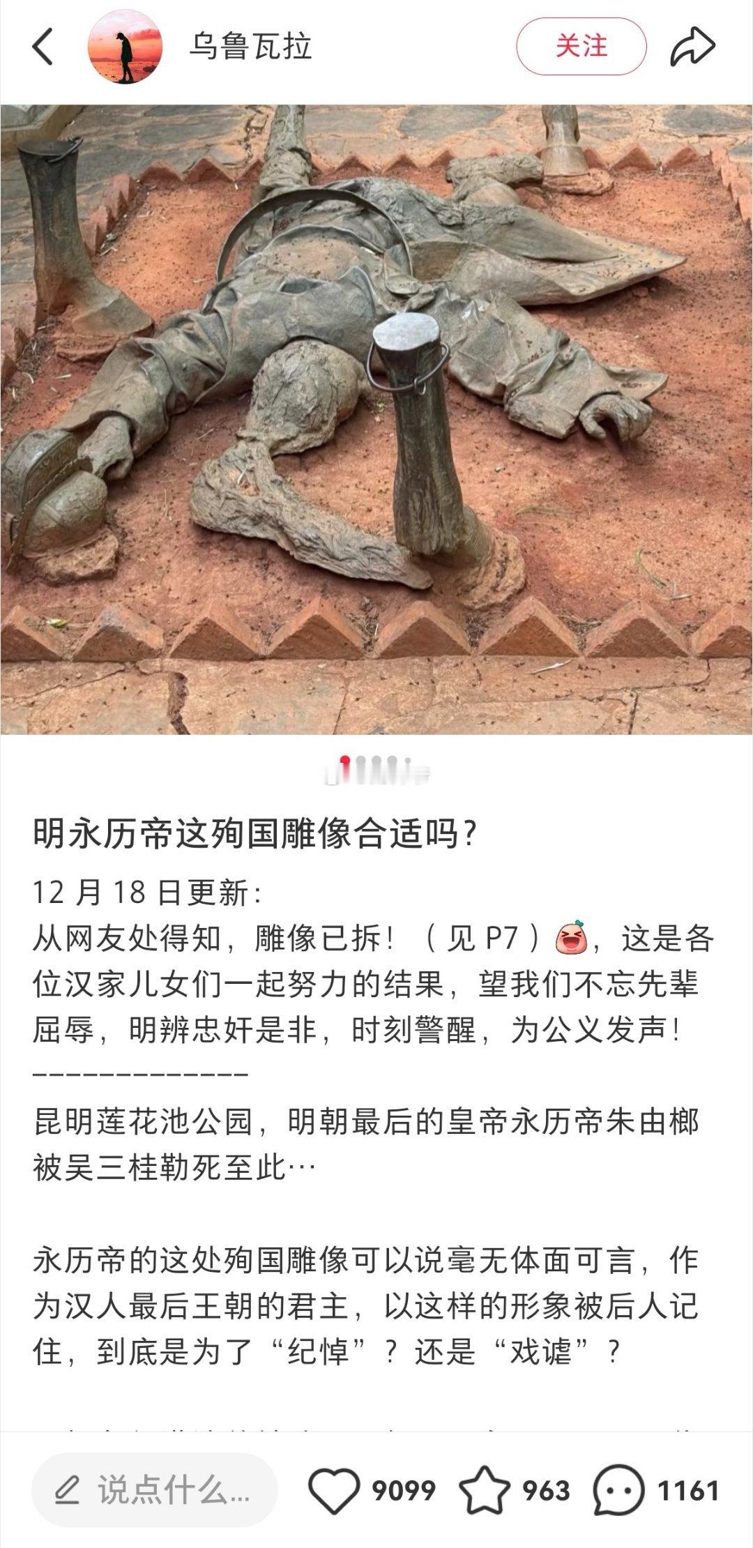 网友爆料:位于昆明莲花池公园内的南明永历帝殉难雕像已被移除。原因是部分游客投诉该雕像“很不体面”。