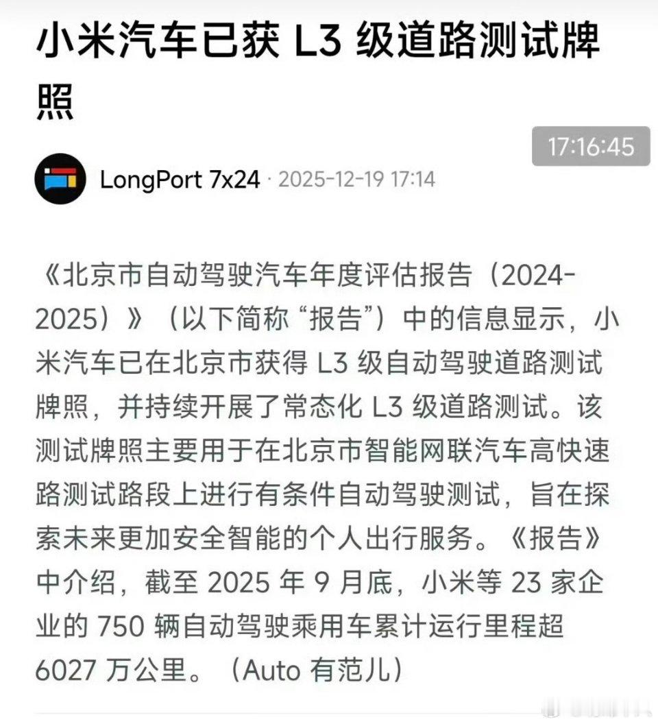 小米汽车在北京市获得了L3级自动驾驶道路测试拍照。
