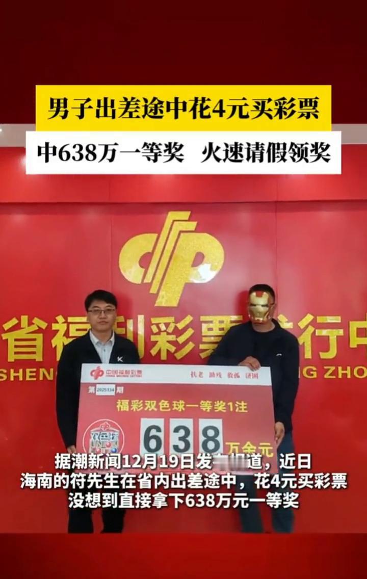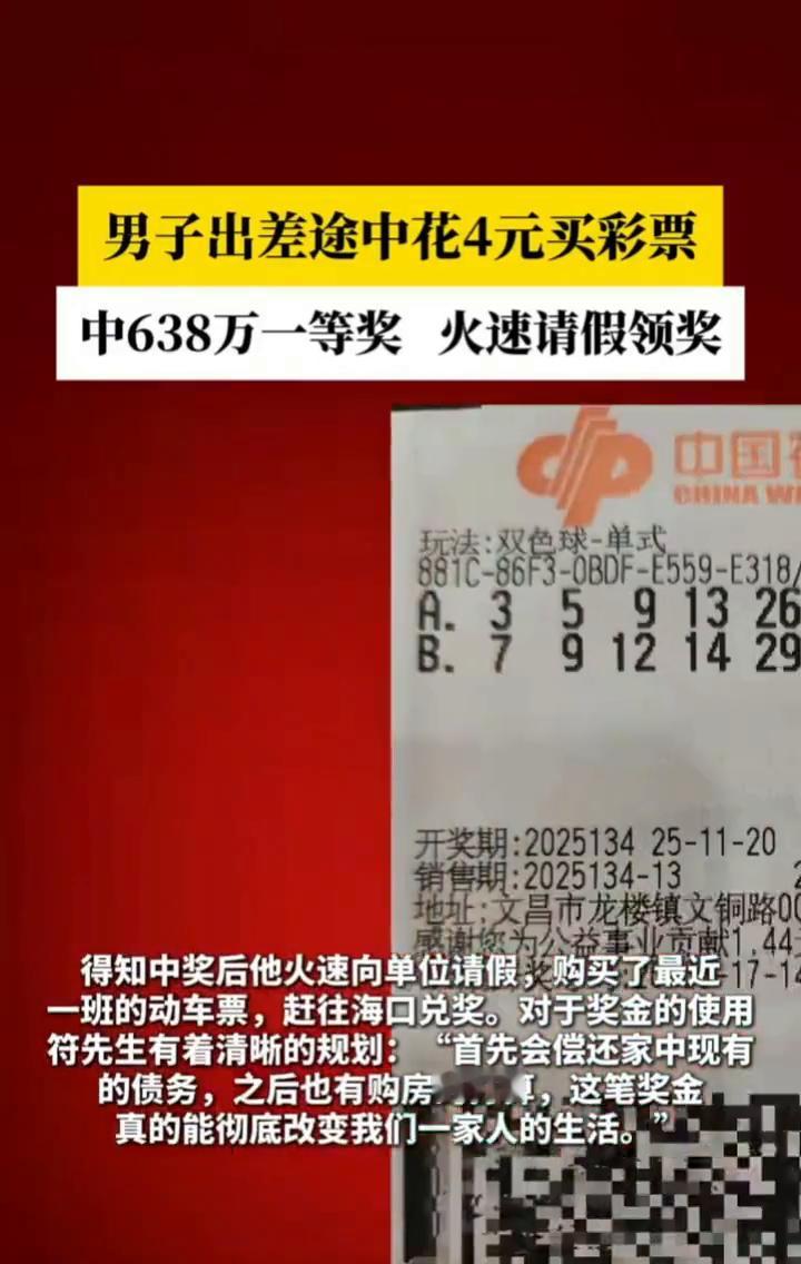 男子出差途中花4元买彩票中638万一等奖,火速请假领奖。 据潮新闻12月19日发布报道,近日海南的符先生在省内出差途中花4元买彩票,没想到直接拿下638万元一等奖。得知中奖后他火速向单位请假,购买了最近一班的动车票赶往海口兑奖。对于奖金的使用符先生有着清晰的规划:"首先会偿还家中现有的债务,之后也有购房的打算,这笔奖金真的能彻底改变我们一家人的生活。"