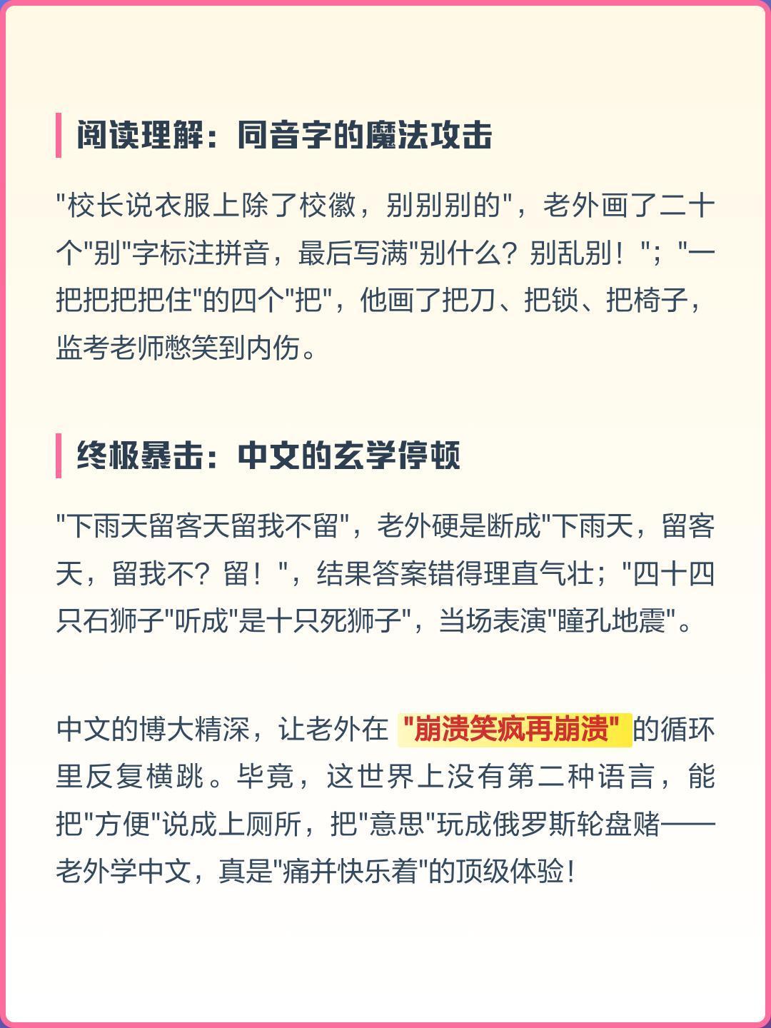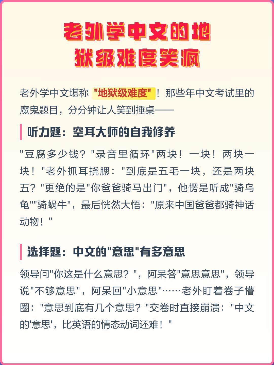 反转来了!中文HSK3.0全球试行,老外终于要体验被“四六级”支配的恐惧了!网友纷纷出题:豆腐两块钱一块还是两块豆腐一块钱?好了坏了傻傻分不清……简直就是国际版“汉语听力惨案现场”! 咱就说,这波文化输出太接地气——以前考英语总被“How are you”套路,如今中文一出手就是地狱难度!建议考场配个方言彩蛋:四川话“你要爪子嘛”翻译题,保准让欧洲学霸当场思考人生。 最精彩的是,全世界终于要统一理解“意思意思”到底几个意思了!期待首场考试后,老外们捧着《中文崩溃实录》含泪高歌:“中国话,果然话中有话!”