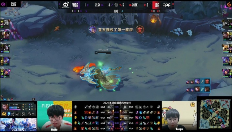 [14:11]暂停回来,Elk芸阿娜推掉JDG下路一塔,Xiaoxu奎桑提推掉WBG下路一塔,双方经济持平。