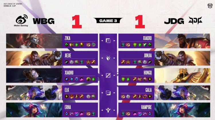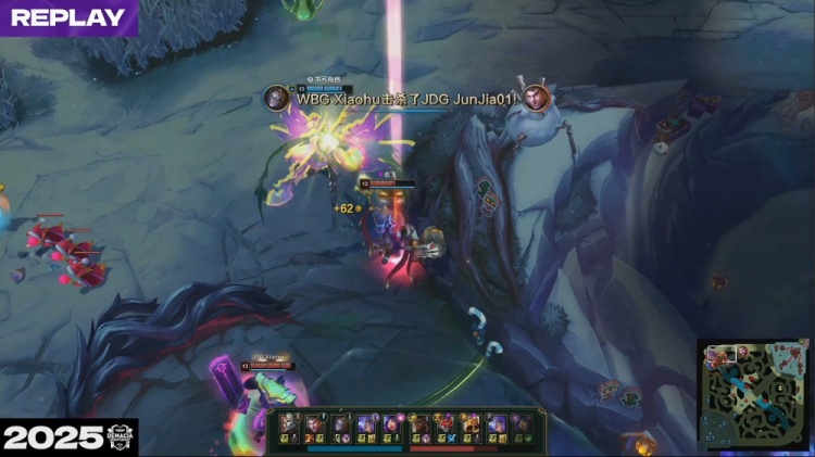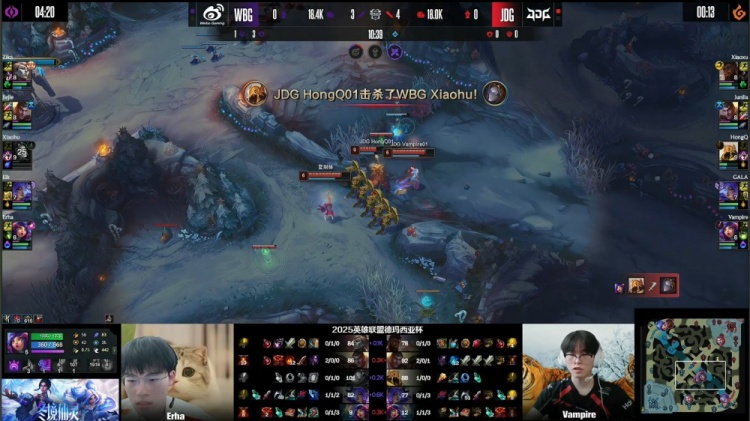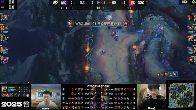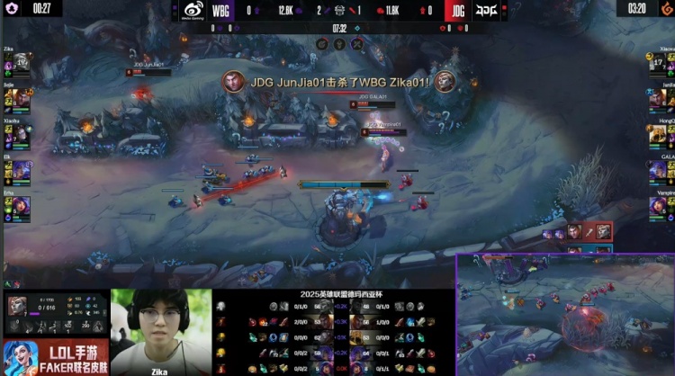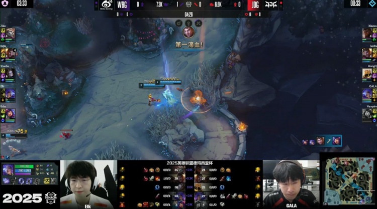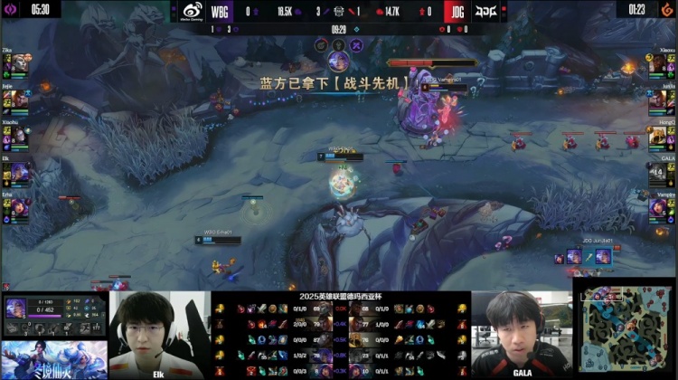 [25:15]中路GALA芸阿娜反杀Elk芸阿娜,随后WBG进野区再杀Junjia杰斯,WBG回头拿到大龙,经济领先6k。