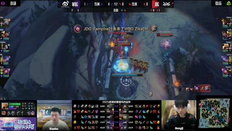 [5:50]JDG吃掉第一条小龙,随后JDG三人越下,Junjia杰斯一炮带走Zika,同时WBG三人越上,Jiejie杰斯击杀Xiaoxu奎桑提。