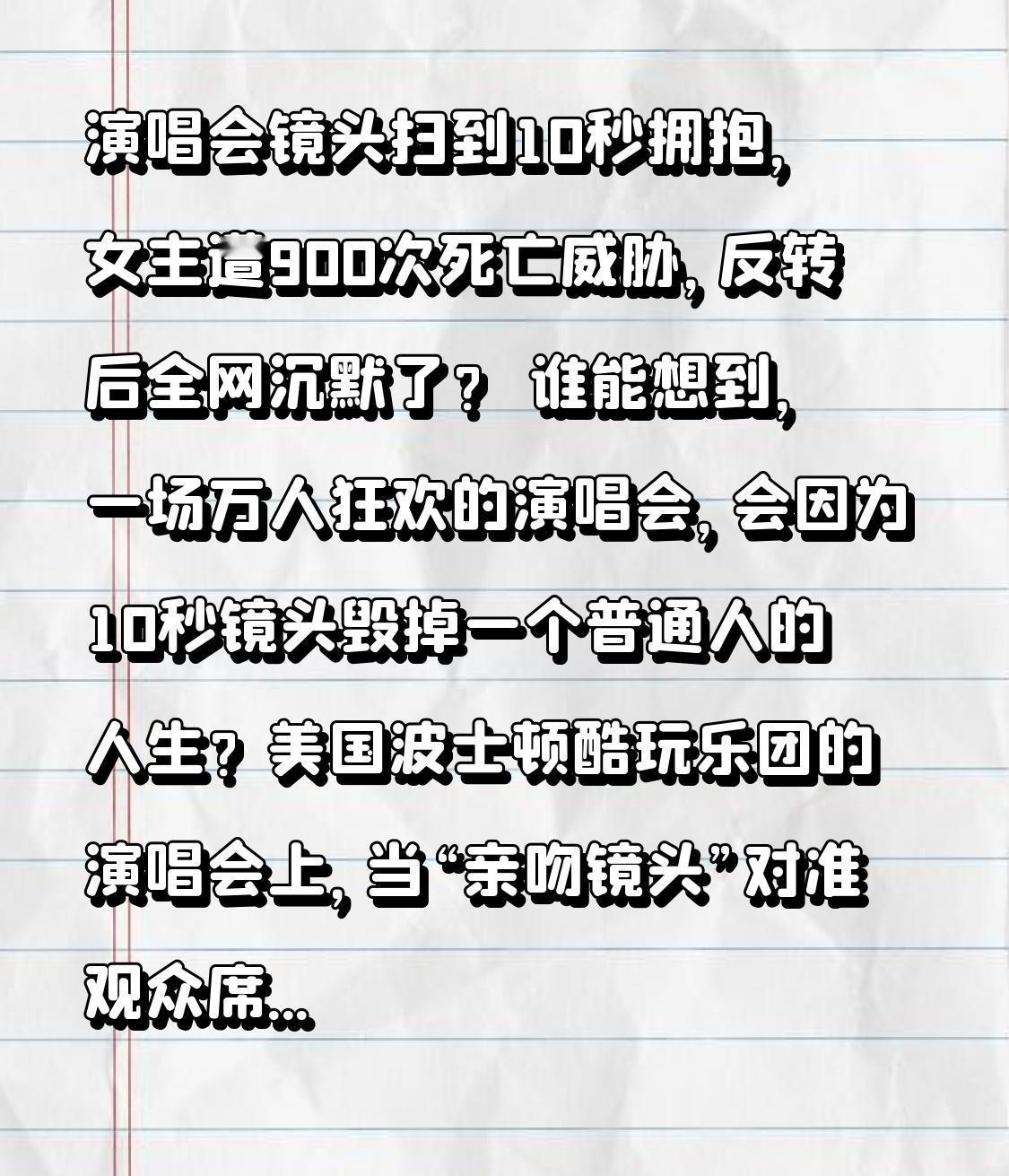 演唱会镜头扫到10秒拥抱,女主遭900次死亡威胁,反转后全网沉默了? 谁能想到,一场万人狂欢的演唱会,会因为10秒镜头毁掉一个普通人的人生?美国波士顿酷玩乐团的演唱会上,当“亲吻镜头”对准观众席时,51岁的CEO安迪和53岁的女高管克里斯汀的拥抱画面,瞬间引爆全网,被贴上“演唱会出轨门”的标签疯狂传播。 起初,舆论一边倒地质疑:两人都是已婚人士,职场上下级公然在演唱会亲昵,妥妥的“婚外情实锤”!网友们顺着网线扒出两人的身份信息,谩骂声铺天盖地。短短三天,克里斯汀收到近900条死亡威胁,“荡妇该杀”“家庭破坏者”的恶毒言论塞满她的手机,甚至有人尾随到她家门口静坐示威。 更让她崩溃的是,公司迫于压力启动调查,尽管结论显示两人并无婚外情,但安迪还是当场辞职,她也只能无奈递交辞呈,多年打拼的事业一夜归零。而她的孩子在学校被同学嘲笑,不愿让她接送,原本平静的家庭彻底陷入混乱。此时,大家都以为她是罪有应得,她的丈夫则被塑造成“无辜受害者”,全网都在为他鸣不平。 可就在舆论发酵两个月后,反转来得猝不及防!有知情人爆料,克里斯汀和丈夫早已分居,当晚她的丈夫根本不是在外地出差,而是也在同一场演唱会上,正陪着新欢约会!更关键的是,安迪和克里斯汀只是多年好友,那天的拥抱是演唱会氛围下的即兴互动,也是两人第一次有身体接触,还因饮酒影响了判断,事后她也坦言这是“错误决定”。 真相曝光后,全网瞬间沉默。原来被骂得最惨的“出轨者”,才是婚姻里早已分居的一方;而大家同情的“受害者”,转头就在同一场合约会新欢。更讽刺的是,同样卷入事件的安迪,虽丢了工作却没遭受到人身攻击,反而被夸“有担当”,只有克里斯汀被网暴折磨得精神濒临崩溃,出门必须带保安,连超市都要伪装出行。 这场闹剧哪里是“出轨门”,分明是镜头断章取义下的舆论狂欢,是性别双标下的恶意围剿。我们总习惯拿着碎片化的信息当真相,用最恶毒的语言进行道德审判,却忘了屏幕那头是活生生的人。一个无心的拥抱,让她丢了工作、毁了生活、连累了孩子,而那些施暴者,在真相大白后也很少有人道歉。 如今克里斯汀已经提起离婚,还成立基金帮助网络暴力受害者。这场演唱会的10秒镜头,照出的不仅是人性的刻薄,更是舆论场的盲目。在信息爆炸的时代,我们或许该多一点耐心、少一点戾气,别让一时的跟风指责,变成刺向陌生人的尖刀。 你怎么看待这场“演唱会出轨门”?欢迎在评论区留下你的观点。