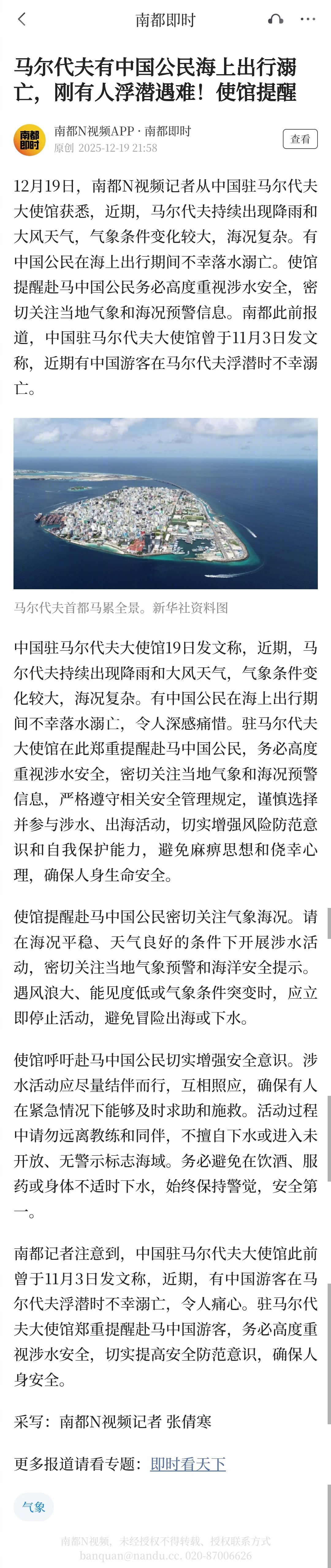 #中国游客在马尔代夫浮潜溺亡#【马尔代夫有中国公民海上出行溺亡,刚有人浮潜遇难!使馆提醒】#中国公民在马尔代夫溺亡#12月19日,南都N视频记者从中国驻马尔代夫大使馆获悉,近期,马尔代夫持续出现降雨和大风天气,气象条件变化较大,海况复杂。有中国公民在海上出行期间不幸落水溺亡。使馆提醒赴马中国公民务必高度重视涉水安全,密切关注当地气象和海况预警信息。南都此前报道,中国驻马尔代夫大使馆曾于11月3日发文称,近期有中国游客在马尔代夫浮潜时不幸溺亡。中国驻马尔代夫大使馆19日发文称,近期,马尔代夫持续出现降雨和大风天气,气象条件变化较大,海况复杂。有中国公民在海上出行期间不幸落水溺亡,令人深感痛惜。驻马尔代夫大使馆在此郑重提醒赴马中国公民,务必高度重视涉水安全,密切关注当地气象和海况预警信息,严格遵守相关安全管理规定,谨慎选择并参与涉水、出海活动,切实增强风险防范意识和自我保护能力,避免麻痹思想和侥幸心理,确保人身生命安全。使馆提醒赴马中国公民密切关注气象海况。请在海况平稳、天气良好的条件下开展涉水活动,密切关注当地气象预警和海洋安全提示。遇风浪大、能见度低或气象条件突变时,应立即停止活动,避免冒险出海或下水。使馆呼吁赴马中国公民切实增强安全意识。涉水活动应尽量结伴而行,互相照应,确保有人在紧急情况下能够及时求助和施救。活动过程中请勿远离教练和同伴,不擅自下水或进入未开放、无警示标志海域。务必避免在饮酒、服药或身体不适时下水,始终保持警觉,安全第一。南都记者注意到,中国驻马尔代夫大使馆此前曾于11月3日发文称,近期,有中国游客在马尔代夫浮潜时不幸溺亡,令人痛心。驻马尔代夫大使馆郑重提醒赴马中国游客,务必高度重视涉水安全,切实提高安全防范意识,确保人身安全。采写:南都N视频记者 张倩寒