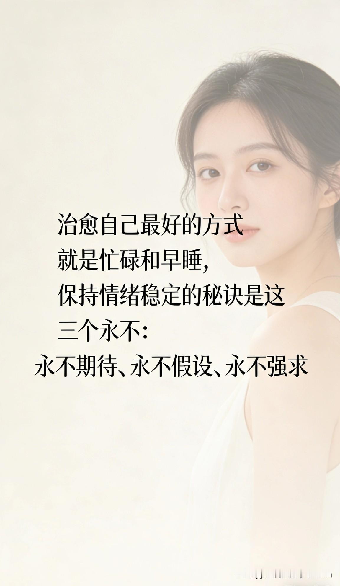 治愈自己就靠两件事, 情绪稳定记住三个“永不”! 最近总听到身边姐妹说“心累”“压力大”,其实治愈自己真没想象中那么难! 总结下来就两件事:让自己忙起来,早点睡觉! 再加上情绪稳定的三个“永不”,保管你内心越来越强大! 先说治愈自己的秘诀: 忙起来:不是瞎忙,而是找点正事儿做!学个新技能、搞副业、运动健身,甚至把家里收拾利索都行!忙起来就没空胡思乱想,成就感还能让你找回自信! 早点睡:熬夜真的伤身又伤神!试试睡前半小时放下手机,泡个脚、听听舒缓音乐,第二天起来精神饱满,心情都跟着好起来! 再说说情绪稳定的三个“永不”: ✅ 永不期待: 别对别人抱太高期待,特别是对老公、孩子、同事!期待越高,失望越大。降低期待,反而容易收获惊喜! ✅ 永不假设: 别总琢磨“他是不是不爱我了”,“领导是不是针对我”。事实没摆面前,别自己脑补剧情,省得自己给自己添堵! ✅ 永不强求: 不是你的别硬抢,感情、工作都一样。强扭的瓜不甜,学会放手,说不定更好的就在后面等着呢! 姐妹们,学会自我疗愈真的太太太重要了!这不是软弱,而是给自己披上一层铠甲。 有了强大的内心,啥挫折都能扛得住!记住:先爱自己,才能爱别人!
