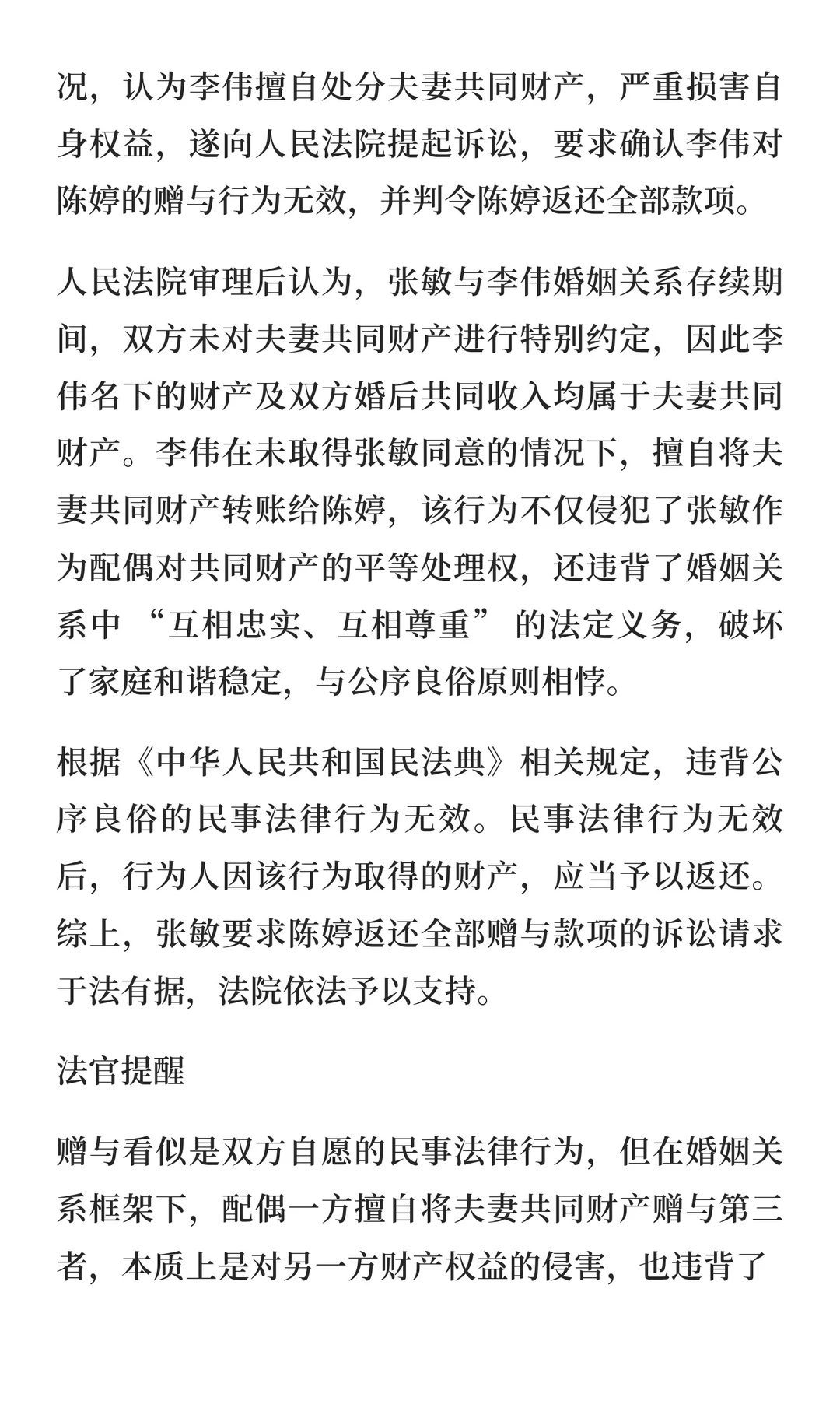 李伟(化名)与张敏(化名)于 2024 年登记结婚。婚后不久,李伟与同事陈婷(化名)逐渐发展为婚外情侣关系。2024 年至 2025 年期间,李伟通过微信、支付宝等方式先后向陈婷转账累计 21 万余元,其中不乏 5200 元、13140 元等具有特殊含义的款项。张敏在整理家庭账单时偶然发现该情况,认为李伟擅自处分夫妻共同财产,严重损害自身权益,遂向人民法院提起诉讼,要求确认李伟对陈婷的赠与行为无效,并判令陈婷返还全部款项。