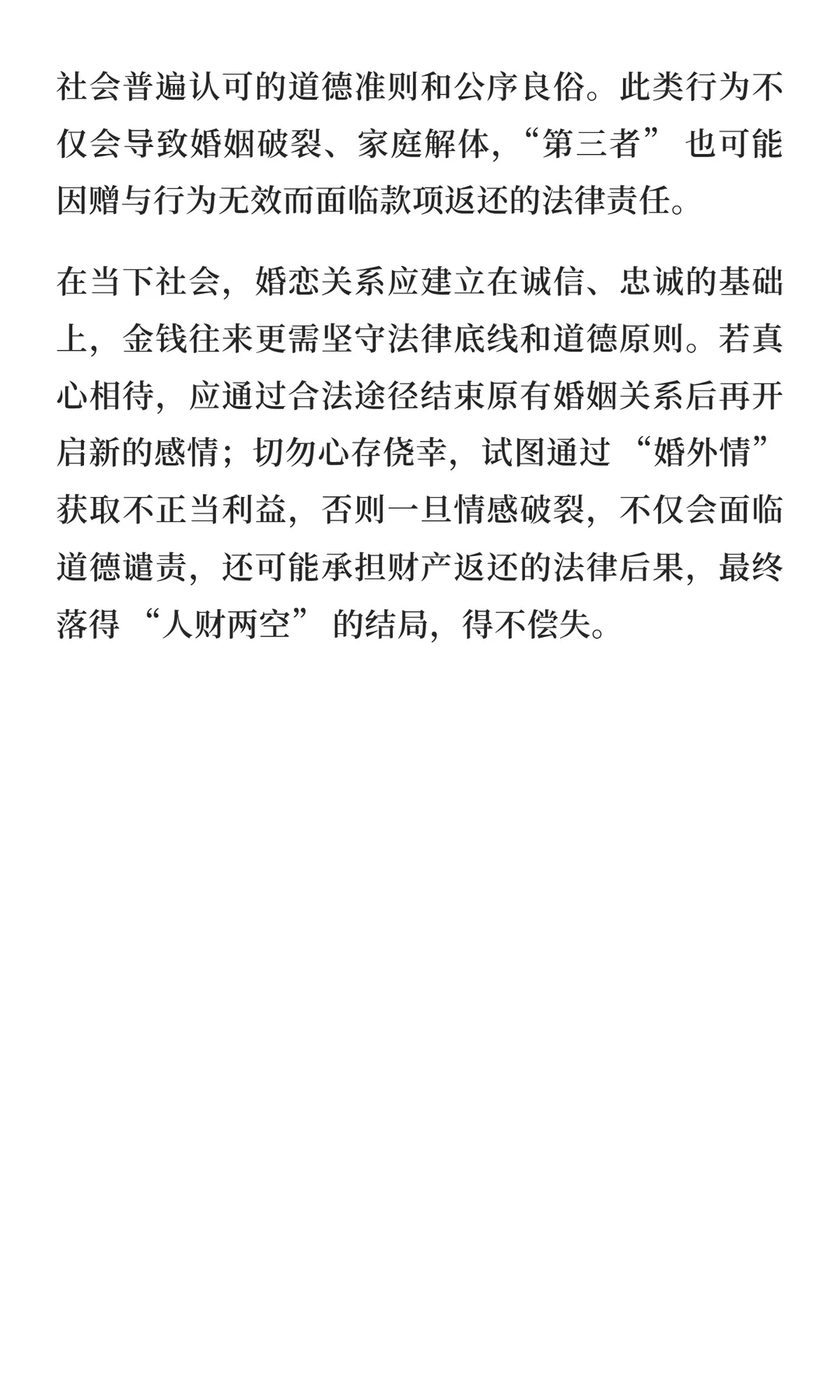 在当下社会,婚恋关系应建立在诚信、忠诚的基础上,金钱往来更需坚守法律底线和道德原则。若真心相待,应通过合法途径结束原有婚姻关系后再开启新的感情;切勿心存侥幸,试图通过 “婚外情” 获取不正当利益,否则一旦情感破裂,不仅会面临道德谴责,还可能承担财产返还的法律后果,最终落得 “人财两空” 的结局,得不偿失。