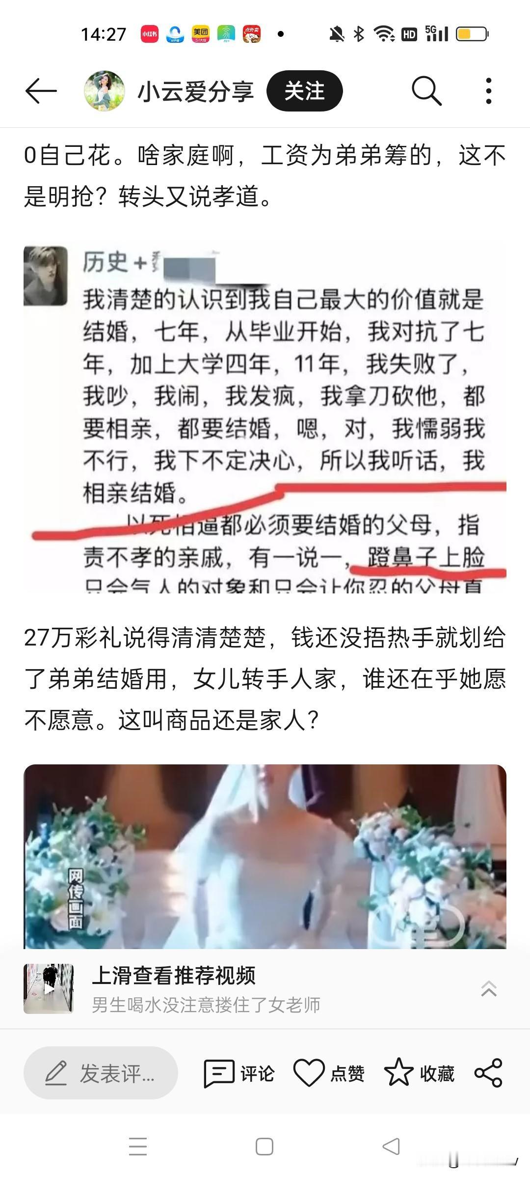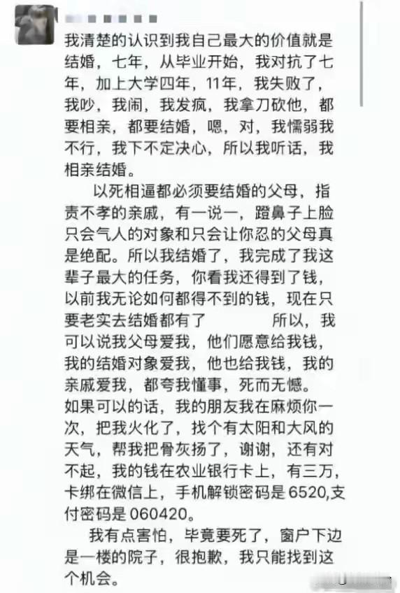 朋友圈最后一个动态竟成了她的绝笔!28岁女教师新婚当日跳楼的悲剧撕开多少家庭的“吸血”遮羞布 新婚本该是人生最甜的高光时刻,河南这位28岁女教师,却在红烛摇曳的新房里,纵身一跃结束了自己的生命。 她不是不爱生活,只是被父母的“催婚魔咒”和“彩礼算计”逼到了绝境。 “不结婚就是不孝”,这句话像一把钝刀子,日复一日割着她的神经。在父母眼里,女儿的幸福不重要,年龄到了就得嫁,嫁了就是给家里挣了面子。他们不管男方人品如何,不管女儿愿不愿意,只把这场婚姻当成完成任务的“KPI”。 更让人寒心的是,他们把男方给的彩礼,一股脑留给儿子攒着娶媳妇。女儿在他们眼里,到底是亲人,还是给儿子铺路的“工具人”? 多少姑娘都听过类似的话:“女孩子读再多书有什么用,不如嫁个好人家”“你弟弟还没结婚,你当姐姐的就该多担待”。这些话裹着亲情的外衣,实则藏着最刺骨的自私。 婚姻自由喊了这么多年,可在一些家庭里,女儿的婚事依然是父母的“私有财产”。他们用“孝道”绑架子女,用“传统”当遮羞布,把女儿的人生当成筹码,去成全儿子的未来。 还有那变了味的彩礼,本是男方对女方的尊重和诚意,如今却成了不少家庭的“敛财工具”。彩礼越高,父母脸上越有光,可他们忘了,这沉甸甸的彩礼背后,压着的是女儿婚后的柴米油盐,甚至是一辈子的委屈。 这位女教师的纵身一跃,是无声的反抗,更是血淋淋的控诉。她用生命告诉我们:没有爱情的婚姻是坟墓,被亲情绑架的婚姻,是比坟墓更冷的深渊。 催婚没有错,错的是用“不孝”绑架人生;彩礼没有错,错的是把女儿当成“提款机”。 生而为人,谁不想拥有一场双向奔赴的爱情,谁不想嫁得心甘情愿、笑得发自肺腑?可在重男轻女的偏见里,在畸形的彩礼陋习里,多少女孩的梦想被碾碎,多少青春被辜负。 这件事你怎么看?是父母的愚昧,还是彩礼的锅?欢迎在评论区说出你的观点,别让这样的悲剧再发生!