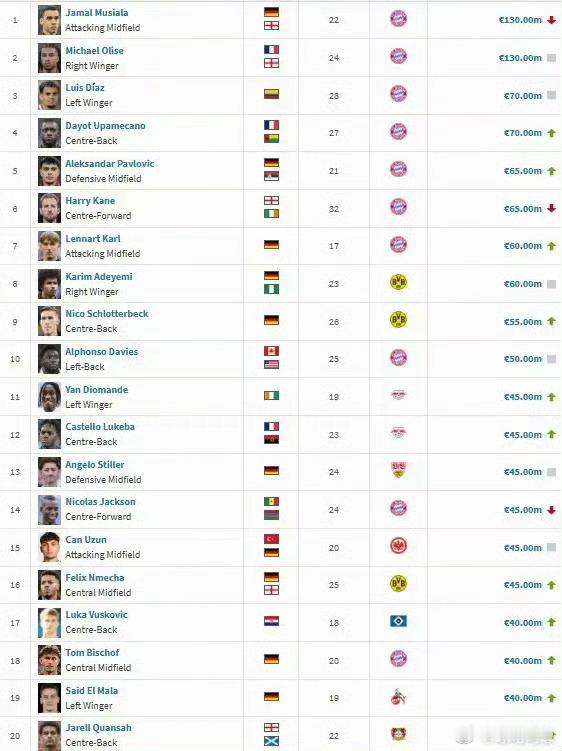 今日德转更新德甲身价,穆西亚拉身价下跌1000万欧至1.3亿欧,与奥利塞并列第一,于帕梅卡诺身价上涨1000万欧至7000万欧与迪亚斯并列第三,凯恩身价下跌1000万至6500万欧,与帕夫洛维奇并列第五,卡尔身价上涨4000万欧至6000万欧。德转管理员对于穆西亚拉和凯恩的评语是:穆西亚拉仍在从重伤中恢复,目前还无法准确预见他何时能重返赛场。凯恩的身价下降则完全是由于年龄增长,这是凯恩身价连续第四次下降,这次下降了1000万欧。
