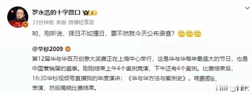 罗永浩这回又要“杀疯了”? 微博上一句“择日不如撞日”,直接要把跟华杉的恩怨摆上台面。 手里攥着录音,却还问能不能发? 这就有点拿大家当外人了。 与其说是征求意见,不如说是通牒,或者是一场精心策划的流量前戏。 咱们这群吃瓜的,早就搬好小板凳了,甚至觉得手里的饺子都不香了。 老罗这个人,从来不按常理出牌,这也是他能屡败屡战的底气。 既然话都说到这份上了,那就别藏着掖着。 把录音放出来,是非黑白,让大众听个真切。 有时候,真相并不复杂,复杂的只是人心里的算盘。