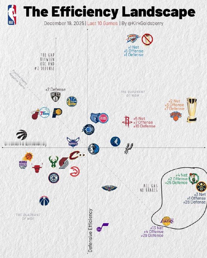 过去10场攻防效率图,湖人防守倒数第二! 进攻前三:掘金、凯尔特人、尼克斯 防守前三:雷霆、篮网、勇士 进攻倒数前三:猛龙、国王、太阳 防守倒数前三:爵士、湖人、奇才 过去10场,勇士居然是防守第三,难以想象!因为过去3场比赛,勇士的防守崩盘了,就这样的态势,扩大到10场比赛,居然还是前三.... 这就和湖人的观感恰好相反了,所有人都知道湖人防守很烂,或者说纯粹没防守,很显然,数据非常支持这一观感,确实没防守。[捂脸]