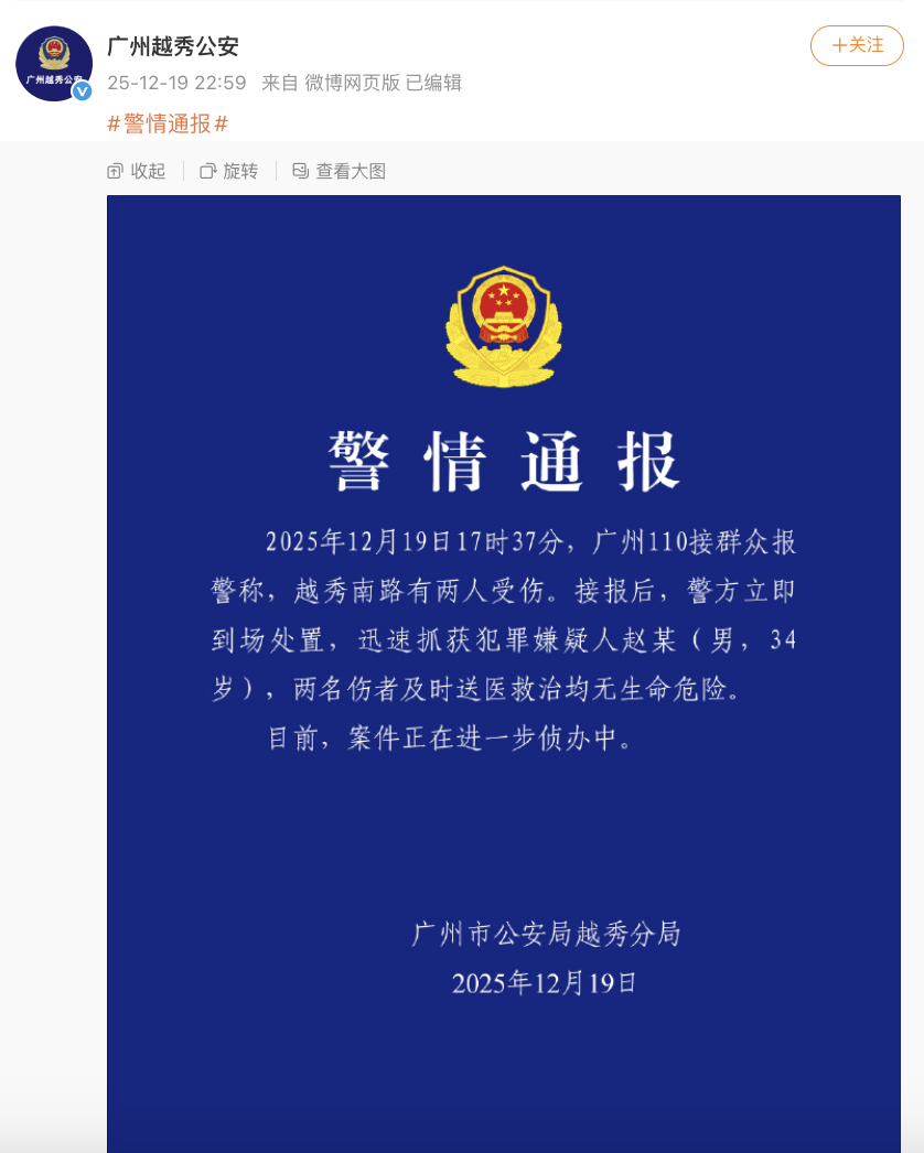 #广州警方通报越秀南路两人受伤#【广州越秀公安:抓获犯罪嫌疑人赵某(男,34岁),两名伤者无生命危险】#广州越秀南路两人受伤嫌犯被抓获#12月19日22时59分,发布警情通报:12月19日17时37分,广州110接群众报警称,越秀南路有两人受伤。接报后,警方立即到场处置,迅速抓获犯罪嫌疑人赵某(男,34岁),两名伤者及时送医救治均无生命危险。目前,案件正在进一步侦办中。