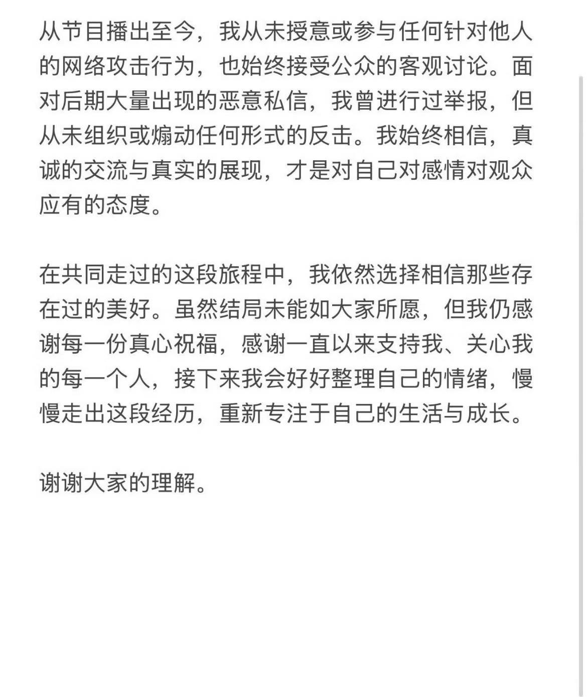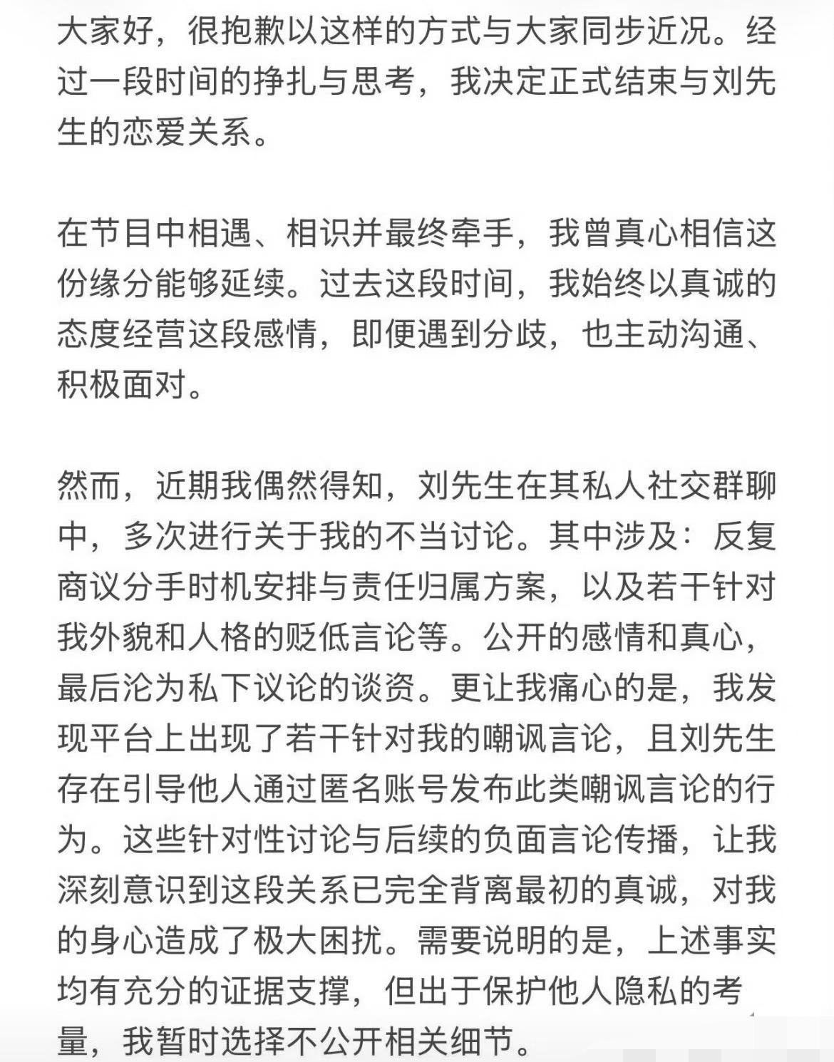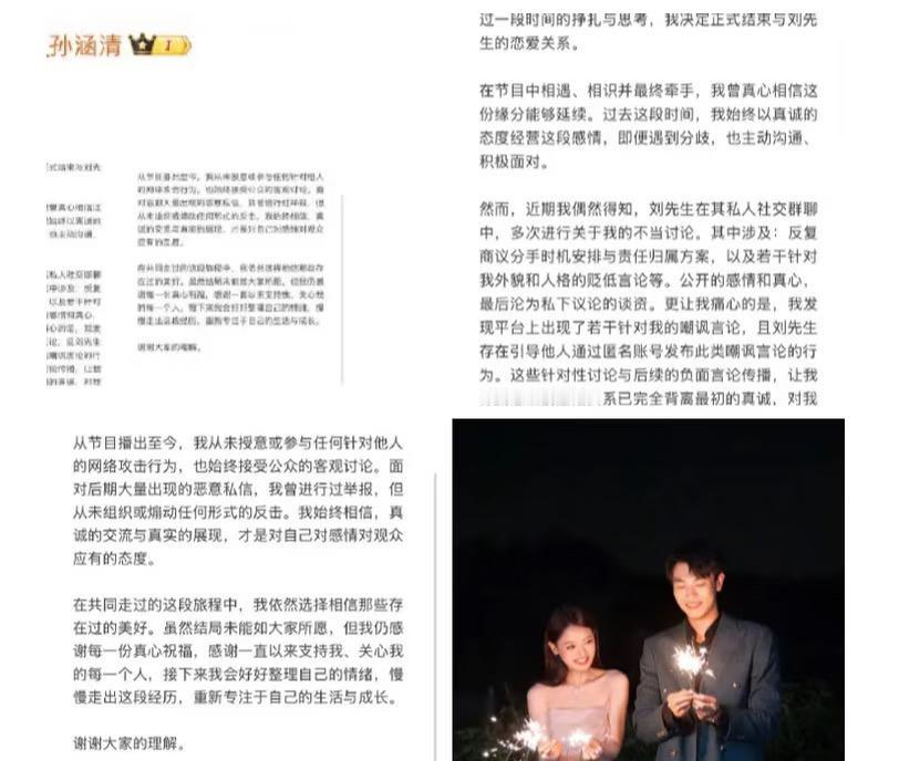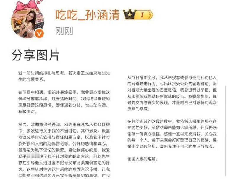 吃吃和刘子晗分手💔。 《心动的信号7》里吃吃是在犹豫不决中选择了刘子晗。 今天吃吃发文宣布与刘子晗分手。 看来是受伤了,洋洋洒洒写了很多,核心其实就是刘子晗人品🈶问题! 记得刘子晗第一次在节目上出场时,因为与女嘉宾蓝蓝认识,当时蓝蓝看到他非常意味深长地笑了,当时网友就猜测蓝蓝好像知道这人不行。