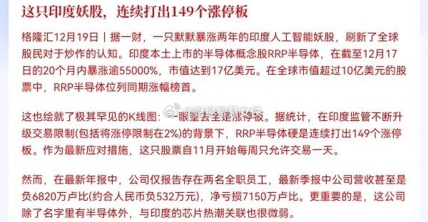 再次见证历史!一家印度半导体概念公司RRP半导体连续打出了149个涨停板!这才是真正的妖股啊!印度股市再次上演股市神话,这或许就是印度股市屡创历史新高的原因,人家股市才真正实现了涨跌都交给市场,而不是人为干预,反观大A股3-5个涨停后,马上就开始了流程,一,提示风险,二,口头警告,三,关小黑屋,最后就是一地鸡毛!建议A股要向印度股市学习,取其精华,去其糟粕,未来在大A股也能出现打出100个涨停的妖股!这真可以让股民吹一辈子!股票