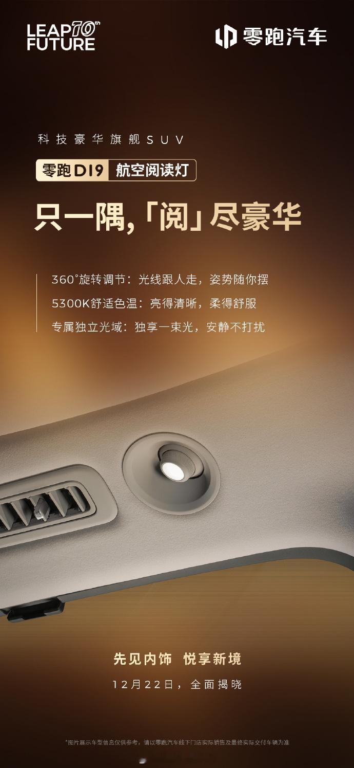 科技豪华旗舰SUV零跑D19,内饰细节先睹为快智能香氛系统:3种定制香型 x 3档浓度可调航空阅读灯,360°旋转调节,光线随人而动;5300K舒适色温静奢壁灯:4处柔光漫射,设计完全没有老登风格,而且高级感和豪华感很强,有望刷新大家对于零跑过去的一贯形象。零跑零跑d19闯入9字辈豪华赛道