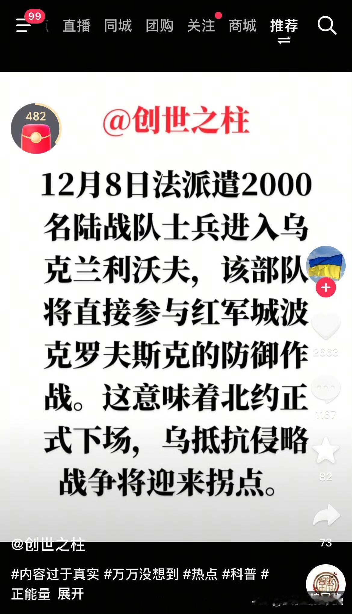#俄乌冲突# 虽然在抖 音世界里,北约和乌克兰军队早已兵临莫斯科城下。 但这并不妨碍马克龙昨晚呼吁普京给个机会见他一面。 #欧盟批准900亿欧元援助乌克兰##特朗普要求乌克兰迅速行动#