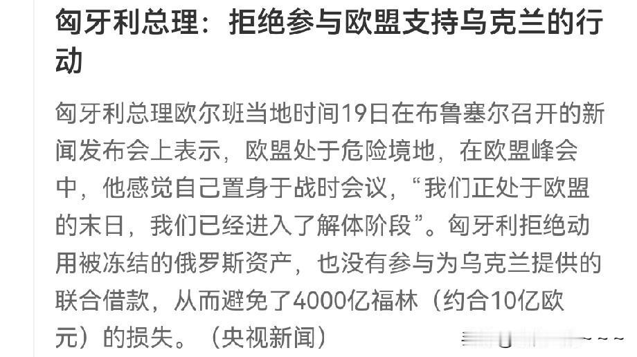 又掀桌子了?[击掌] 就在刚刚,匈牙利总理对欧盟简直是失望至极,就是差一点脱离欧盟了,把欧盟贬的啥也不是?几乎是一文不值了? 你看看他怎么说的,他说他参加欧盟会议,就像置身于战时会议,欧盟已经进入了末日,已经进入了解体阶段… 反正在他看来,欧盟在乌克兰问题上的决策是严重失误,与匈牙利的利益是南辕北辙,带不来一点好处。当然欧尔班的意见跟美国和俄罗斯是一致的。这不就是跟脱欧差不多了吗? 至于,这次欧盟会议决定的接下来2年要向乌克兰提供900亿美元贷款。匈牙利,捷克,斯洛伐克三个国家是明确反对,坚决不支持,在他们看来这就是一个致命的错误。