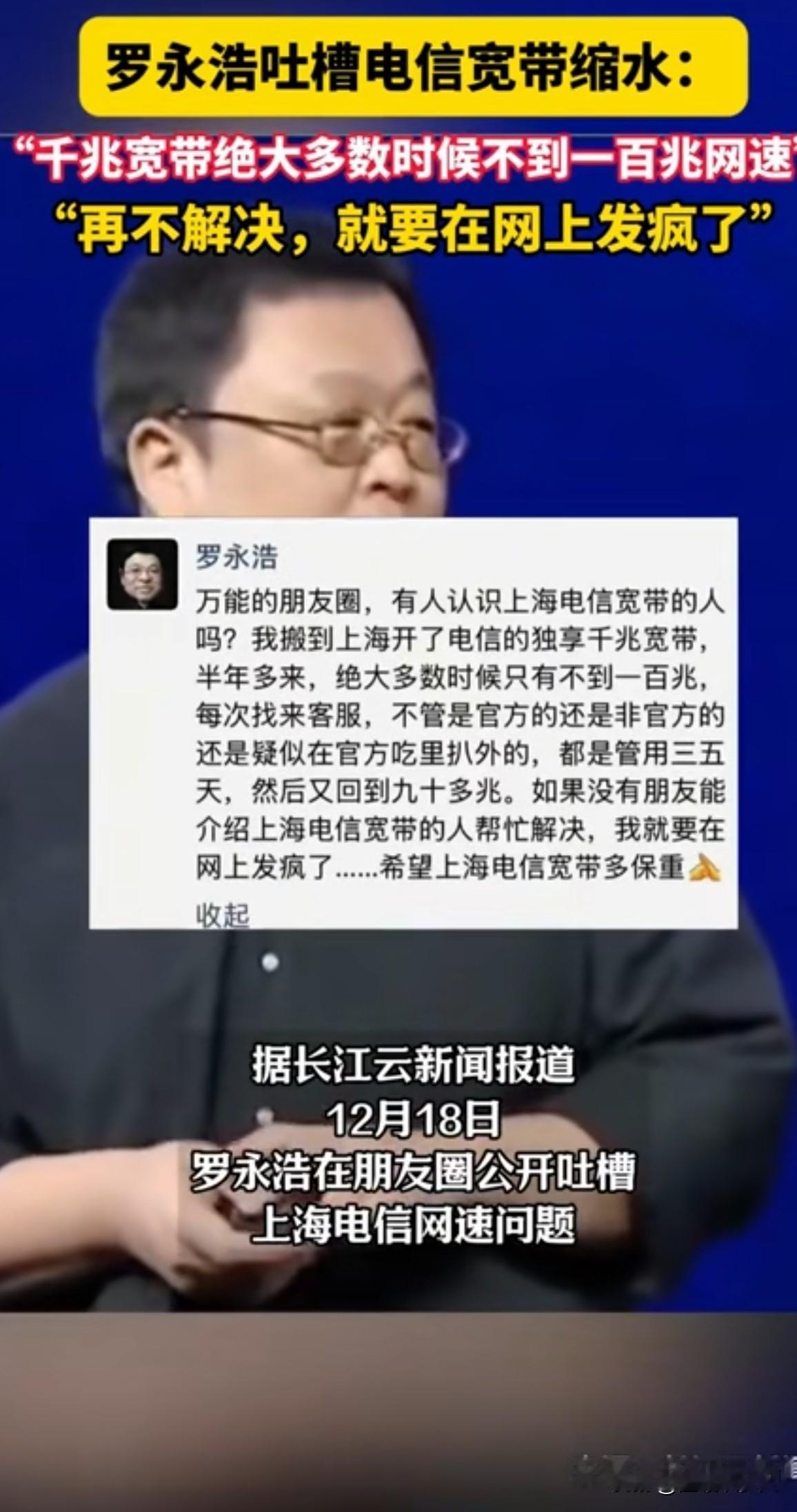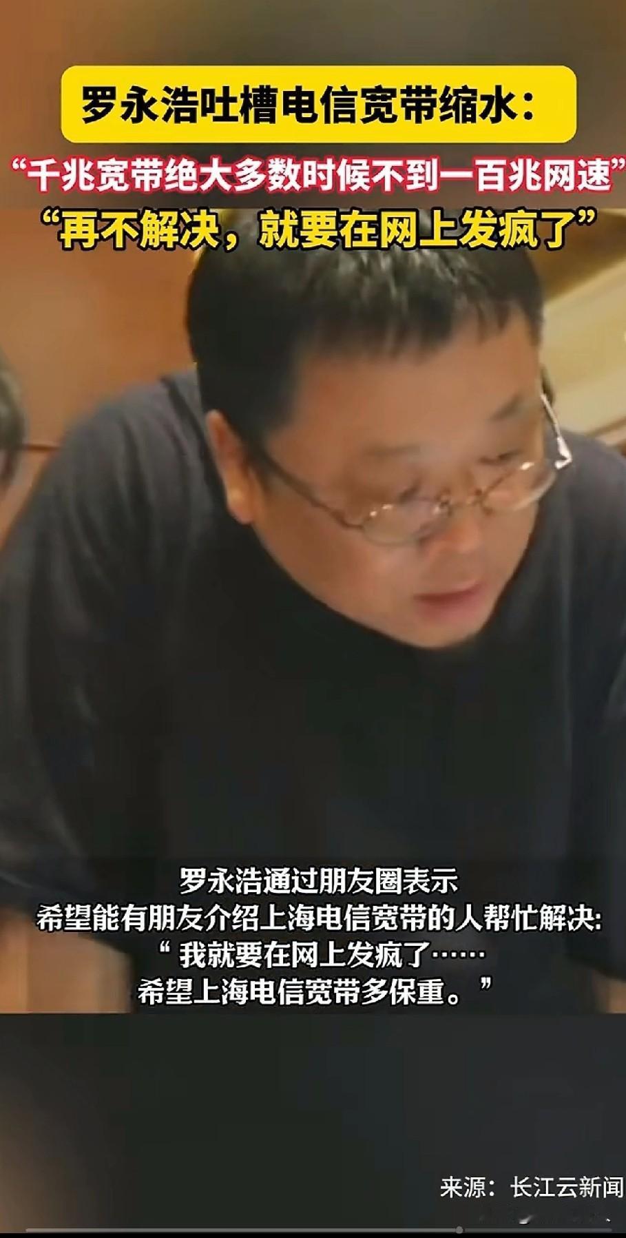 连罗永浩都搞不定的宽带,你猜普通人得有多绝望? 半年前他在上海开通电信"独享千兆",实测竟缩水九成。 客服每次修完管用三五天,网速又跌回90兆。老罗朋友圈直接喊话:"再不解决,我就要在网上发疯了!" 反转来了!上海电信次日火速回应。 可声明全程甩锅给用户:户型结构不行、路由器不达标、墙体太厚挡信号... 就是绝口不提自家设备问题。“ 可网友扒出老罗住的是精装大平层,承重墙还没明星公关的嘴硬。 这操作早有前科。黑猫平台7月就有用户投诉: 签约的100M上行宽带被偷偷限速到5M。 装维小哥现场检测出异常,电信总部却咬死"数据正常"。用户远程医疗会诊直接卡成PPT。 普通用户投诉三个月无人问津,罗永浩发声48小时内客服连夜上门——原来网速快慢,全看维权音量大小?” 更荒诞的在抖音商城。 有消费者买200兆宽带套餐,实测连百兆都跑不满。 报修三个月,客服只登记不解决。质问是否虚假宣传?电话那头只剩忙音。 评论区早炸开锅:"我千兆宽带测出35兆,电信说'够用就行'" "修了8次叫我换299路由器,结果速度纹丝不动" 最绝的是这句:"罗永浩分明是电信最佳测试员——他若跑不满,必是基站瘫!" 事件发酵后神奇一幕出现: 投诉过的用户突然接到回访,网速一夜达标。 可老罗微博又晒出新截图:"修完第四天,下载速度第18次跌破百兆..." 文章开头那句"暴风雨前的宁静", 此刻听来像惊雷。当维权需要名人以"发疯"相逼, 普通人的声音,早被淹没在客服的忙音里。 不知你们有没有遇到过这样的烦麻能?