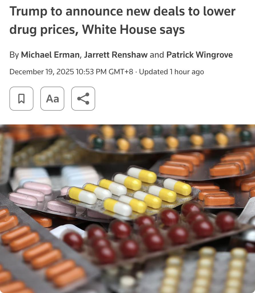 外媒:特朗普计划宣布新的药品降价协议。 白宫表示,特朗普将于12月19日宣布旨在降低处方药价格的新协议。预计包括艾伯维、百时美施贵宝、吉利德科学和默克在内的多家大型药企将宣布部分药品降价协议。瑞士药企诺华和罗氏也可能会参与。 此前特朗普曾要求17家大型制药公司为美国的医疗援助计划提供最惠国价格,并保证新药在美国的上市价格不高于其他高收入国家。目前已有辉瑞、礼来等五家公司与政府达成价格限制协议。