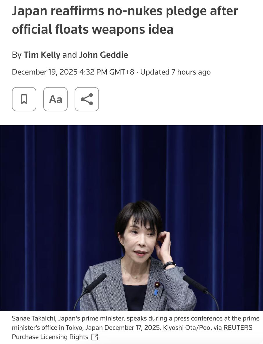 外媒:12月19日报道,日本政府重申坚持数十年的“无核三原则”,即不拥有、不制造