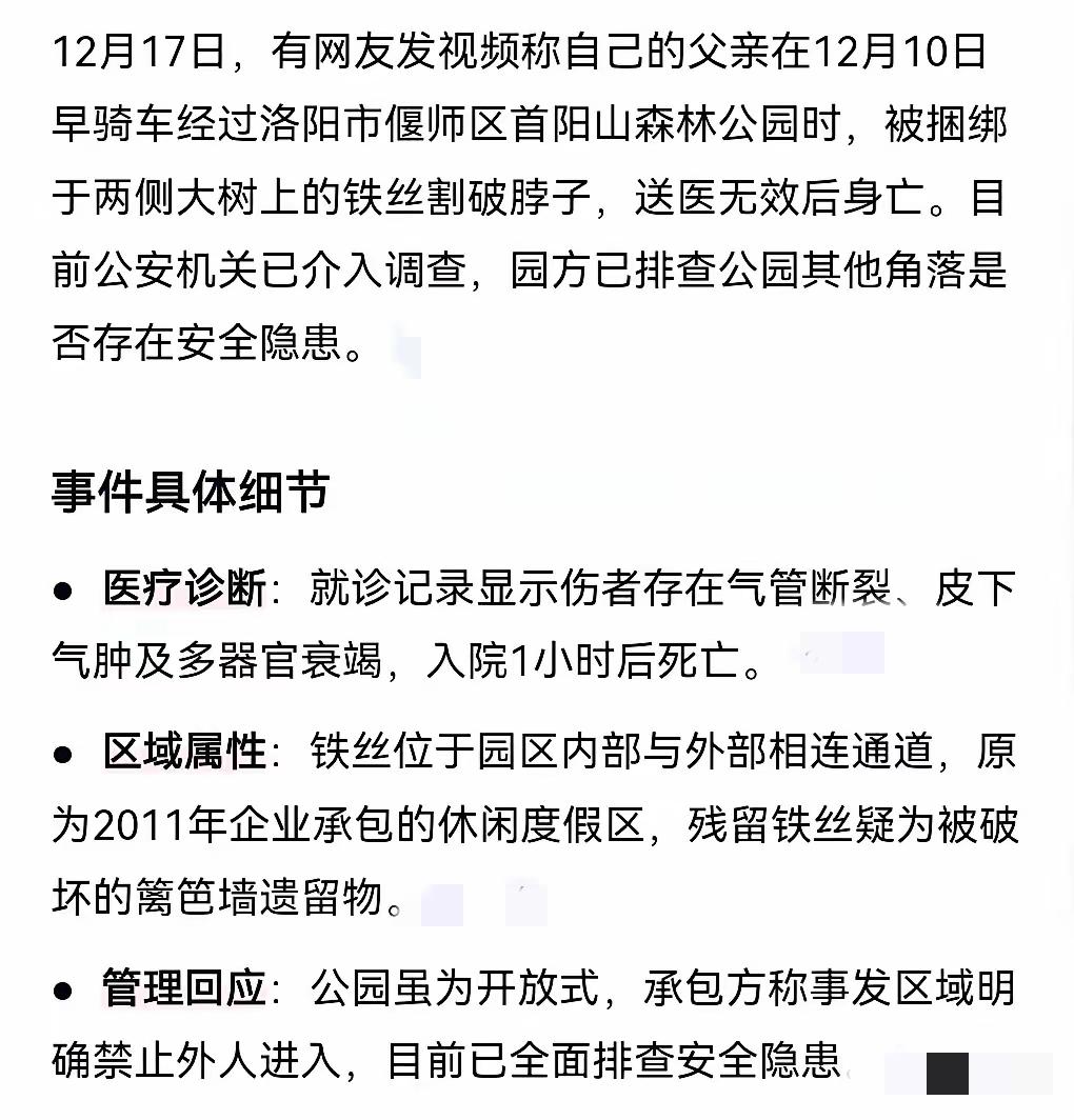 洛阳59岁大叔骑三轮车路过首阳山森林公园,谁能料到竟被两棵大树之间的铁丝直接割脖子,最后送医后还是没能救回来,真是祸从天降,防不胜防啊! 可比起这桩让人揪心的悲剧,更让人生气的是园方的态度,一出事就拿“私人承包区”当挡箭牌疯狂甩锅,说铁丝是旧篱笆残留,可是这样的东西不怕一万就怕万一啊,连个警示牌或者标识都懒得装,这不是明摆着管理不善吗? 且最让人意难平的是,好好的一个大活人说没就没,这事搁谁家谁不崩溃啊!咱就说公园既然是开放式的,那细小的安全隐患还是得防范起来啊,就得负起安全责任,不能一出事就拿“承包”当免死金牌啊!悲剧 管理漏洞 公园 生命至上 安全第一