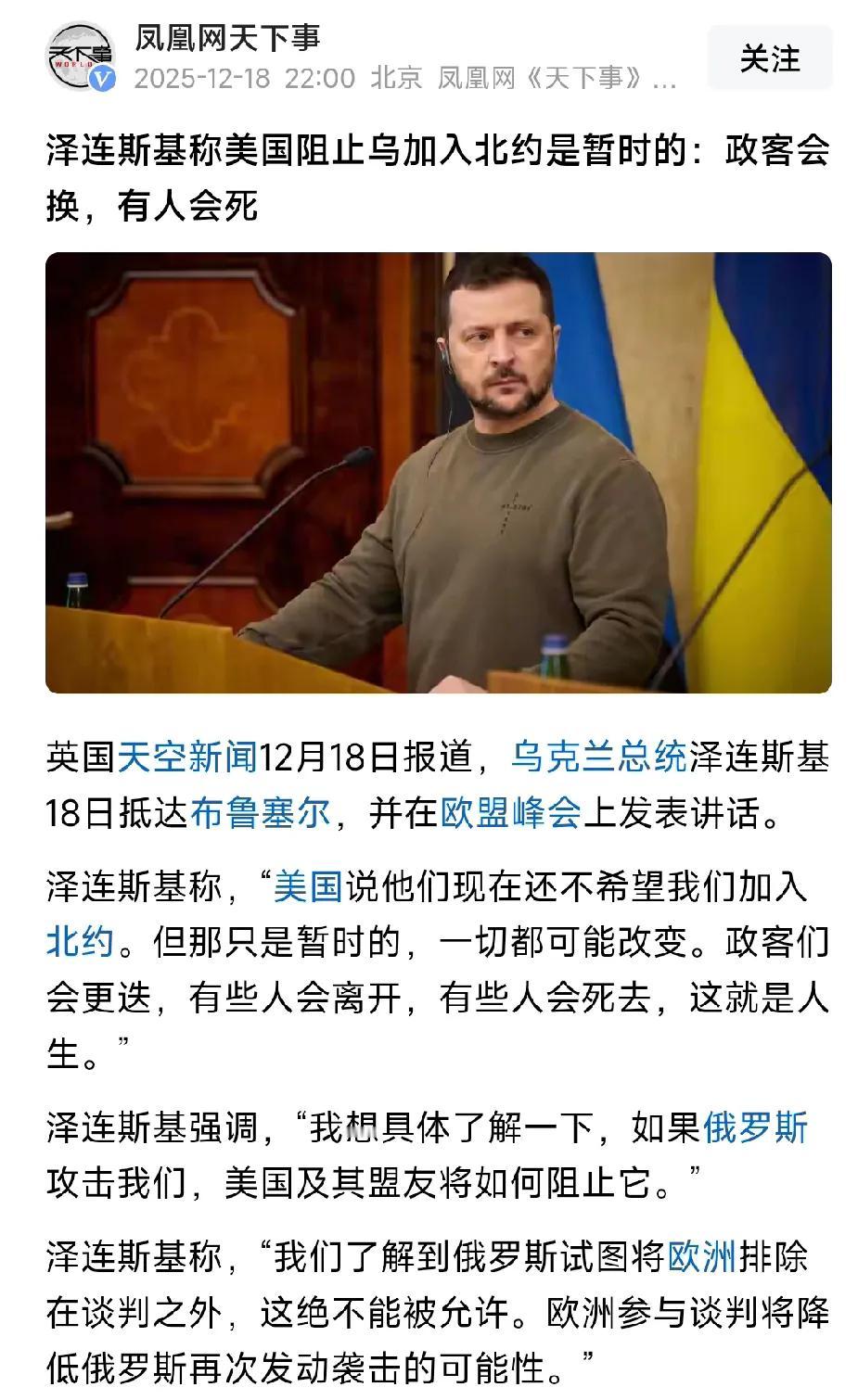 美国还不希望乌克兰加入北约!别执迷不悟了!泽连斯基称:美国说他们现在还不希望我们加入北约。但那只是暂时的,一切都可能改变。政客们会更迭,有些人会离开,有些人会死去,这就是人生。我想具体了解一下,如果俄罗斯攻击我们,美国及其盟友将如何阻止它。我们了解到俄罗斯试图将欧洲排除在谈判之外,这绝不能被允许。欧洲参与谈判将降低俄罗斯再次发动袭击的可能性。 泽连斯基与其说话拐弯抹角,不如直接说美国人告诉他特郎普会死去,这不就行了?这样要是特郎普知道,肯定会先把他捧上天了。把自己的安全、希望寄托在别人身上,终将到头来还是要亡国的。 乌克兰能加入北约的唯一可能性,是他们的GDP占全球的一半,军事力量比整个北约加日韩还强,美国需要对付,才会把俄罗斯跟乌克兰一起拉进北约,这一天的到来以许几十年以后了。斯基没有说错,这个世界逆文明潮流的老6,只会是短暂的,历史的耻辱柱已给他们留下名字,世界文明潮流,终将浩浩荡荡。 这样总统泽连斯基,总想依靠别人求生活,则今日的求生不得求死不得,就是乌的结果!别指望斯基签协议,那只是美俄的一厢情愿。北约 北约中立性 北约新机制 北约委员会 北约进驻乌克兰 美国北约 北约高官访基辅