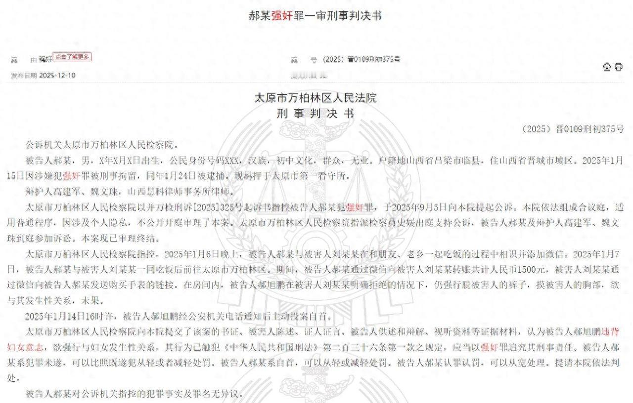 “冤不冤?”山西太原,男子郝某参加聚会后,与女子开房欲强行与对方发生关系,虽然因对方不断反抗放弃,但是对方事后报警!男子悲剧了,被判处有期徒刑1年3个月。 好多人都在问:他冤不冤?是踩了法律红线,还是掉进了道德陷阱? 1月6号晚上,郝某在一场聚会上认识了刘某某,互相加了微信,第二天,两人又约着见了面,一起吃了顿饭。 饭后郝某提议去酒店坐坐,刘某某倒是答应了,但说得明明白白:“去可以,就纯聊天,我还在等朋友。” 郝某一听这话,没当回事,反而通过微信转了1500块钱红包给刘某某,刘某某收了红包,还把一个手表的购买链接发给了郝某。 在郝某眼里,这一连串操作,估计就等于“默认可以更进一步”了。 可到了酒店房间,事儿就变味了。郝某立马暴露了真实想法,一把抱住刘某某,想强行发生关系。 过程中,他不仅脱了自己的裤子,还动手摸刘某某的胸部,刘某某拼命反抗,又喊又推,郝某始终没能得手,见实在没法得逞,郝某才停了手,而刘某某一摆脱控制,立马就报了警。 之后警方给郝某打了电话,他主动到派出所投案自首,案件也就正式进入了司法程序。 法院审理的时候,核心争议点就两个:收了1500块红包,算不算同意发生关系?跟着去了酒店,是不是就默认了? 答案是都不算,法院查明,刘某某从一开始就划清了底线——去酒店只是聊天。到了房间里的激烈反抗、事后第一时间报警,也反复印证了她“不同意”的态度。 法官在判决里特意强调:性同意这东西,必须是明明白白说愿意,而且全程都得算数,不能靠猜,更不能觉得送了钱、请了饭就默认同意了。 收红包、要手表是财物往来,和同不同意发生性关系是两码事,不能混为一谈。 郝某和他的律师辩解说,刘某某明知道去酒店可能发生什么,还收了钱,应该对后果有预期,但这说法在法律上根本站不住脚。 我国刑法里,强奸罪的核心就是“违背妇女意志”。不管之前多暧昧,不管有没有送礼物、花过钱,只要女方明确拒绝,男方还强行来,就是犯罪。 就像之前山西另一起订婚强奸案的审判长说的,哪怕是订了婚、收了彩礼,也不能默认女方同意发生关系,更别说只是刚认识的朋友了。 那个案子争议很大,在这里就不讨论了,但本案当中,事实是清楚的,女方一开始就说了不行。 郝某之所以是未遂,是因为他想干坏事,但因为刘某某的激烈反抗,客观上没干成,属于“想干但干不成”,如果是犯罪中止,那得是他自己主动停下,主观上不想干了。 这两者的处罚差别很大,中止可能会免予处罚或者大幅减刑,而未遂只是可以从轻或减轻处罚。 最后法院认定,郝某构成强奸罪未遂,考虑到他有自首情节,到案后认罪认罚,而且是初犯、偶犯,没造成严重后果,判了1年3个月。 别觉得这刑期重,全国同类强奸未遂案,大多是2到3年起步,郝某这1年3个月的判决,已经是考虑到各种从轻情节后的偏轻结果了。 网上还有人质疑,刘某某是不是在“钓鱼”,是不是“仙人跳”?就算真有这种怀疑,男方也不能用“强行发生关系”来回应。 遇到这种疑似金钱陷阱的情况,正确的做法是保留聊天记录、转账凭证,然后报警维权,你要是一时冲动强来,不管对方是不是有问题,你都先犯了法,最后吃亏的还是自己。 还有人觉得,女方收了红包、要了手表,本身也有问题。这点确实,从道德层面说,刚认识就收大额红包、要贵重礼物,确实容易让人误会。 但法律不管道德层面的吐槽,只看核心事实:她有没有同意发生关系? 本案里,刘某某的反抗和报警,已经把“不同意”写得明明白白了。所以哪怕有人觉得她道德上有瑕疵,也不影响郝某构成犯罪的认定。 这案子其实给所有人都上了一堂法律课,尤其是在男女交往中,几个底线必须记牢。 对男方来说,千万别抱着“我花钱了,你就得听我的”“都跟我去酒店了,还装什么纯”的想法。这种想法特别危险,很容易把自己送进监狱。性同意是动态的,哪怕前一秒同意了,后一秒说不,也得立马停下,这是法律红线,碰不得。 就算是男女朋友、夫妻,只要一方明确拒绝,另一方还强行来,也可能构成强奸罪。之前就有不少婚内强奸被判刑的案例,足以说明法律对性自主权的保护有多严格。 说到底,郝某一点都不冤,法律不看你是不是“误会了”,也不看你是不是“觉得委屈”,只看你有没有越界。 他把金钱往来和性同意画了等号,又在女方明确反抗的情况下强行动手,这就是犯罪,就得承担后果。 性同意不是猜谜游戏,更不是金钱交换。明明白白的“愿意”才是唯一标准,任何时候,尊重别人的身体自主权,就是保护自己不踩坑。 参考信源: 太原一男子对饭局初识女子强奸未遂:因投案自首从宽处理 2025年12月17日 内蒙古晨报