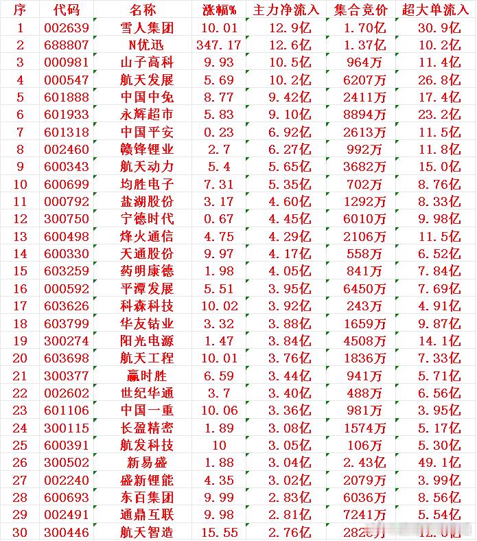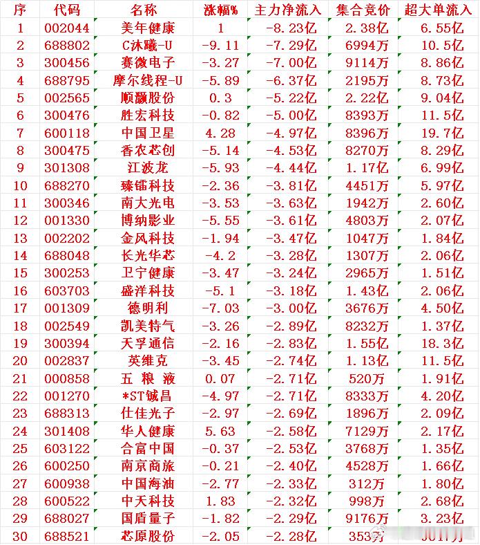 12月19日收盘,主力资金,已经大幅卖出的30名单:美年健康:净流出8.23亿元C沐曦-U:净流出7.29亿元赛微电子:净流出7.00亿元摩尔线程-U:净流出6.37亿元顺灏股份:净流出5.22亿元胜宏科技:净流出5.00亿元中国卫星:净流出4.97亿元香农芯创:净流出4.53亿元江波龙:净流出4.44亿元臻镭科技:净流出3.81亿元南大光电:净流出3.63亿元博纳影业:净流出3.61亿元金风科技:净流出3.47亿元长光华芯:净流出3.28亿元卫宁健康:净流出3.24亿元12月19日收盘,主力资金“大幅买入”的30名单:雪人集团:净流入12.9亿元N优迅:净流入12.6亿元山子高科:净流入10.5亿元航天发展:净流入10.2亿元中国中免:净流入9.42亿元永辉超市:净流入9.10亿元中国平安:净流入6.92亿元赣锋锂业:净流入6.27亿元航天动力:净流入5.65亿元均胜电子:净流入5.35亿元盐湖股份:净流入4.60亿元宁德时代:净流入4.45亿元烽火通信:净流入4.29亿元天通股份:净流入4.17亿元药明康德:净流入4.05亿元
