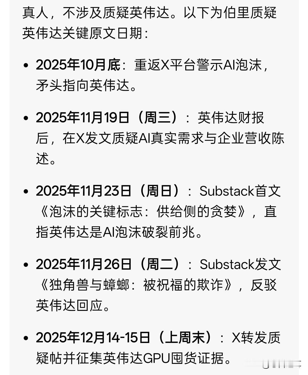 迈克尔.伯里质疑英伟达,就不是怕收到律师函吗? 今天晚上突然看到美国知名空头迈克尔.伯里发质疑帖并征集英伟达GPU囤货证据。这不是他第一次质疑英伟达了。 以下为伯里质疑英伟达关键原文日期: 2025年10月底:重返X平台警示AI泡沫,矛头指向英伟达。 2025年11月19日(周三):英伟达财报后,在X发文质疑AI真实需求与企业营收陈述。 2025年11月23日(周日):Substack首文《泡沫的关键标志:供给侧的贪婪》,直指英伟达是AI泡沫破裂前兆。 2025年11月26日(周二):Substack发文《独角兽与蟑螂:被祝福的欺诈》,反驳英伟达回应。 2025年12月14-15日(上周末):X转发质疑帖并征集英伟达GPU囤货证据。 如果把他提出质疑同英伟达股票走势结合起来看。这期间就是英伟达股票这波下跌的区间。 先不说他对错与否,他这种行为要是在我们这里,会有什么结果。 大概如下:口水战;律师函;可能的找叔叔;被禁言……还有什么?大家补充!
