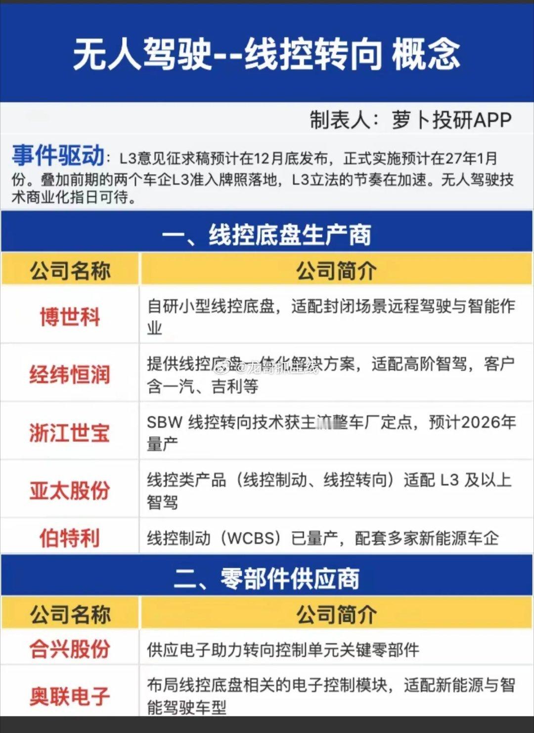 无人驾驶--线控转向 概念!L3意见征求稿预计在12月底发布,正式实施预计在27年1月份。叠加前期的两个车企L3准入牌照落地,L3立法的节奏在加速。无人驾驶技术商业化指日可待。受益股:1.线控底盘生产商2.零部件供应商
