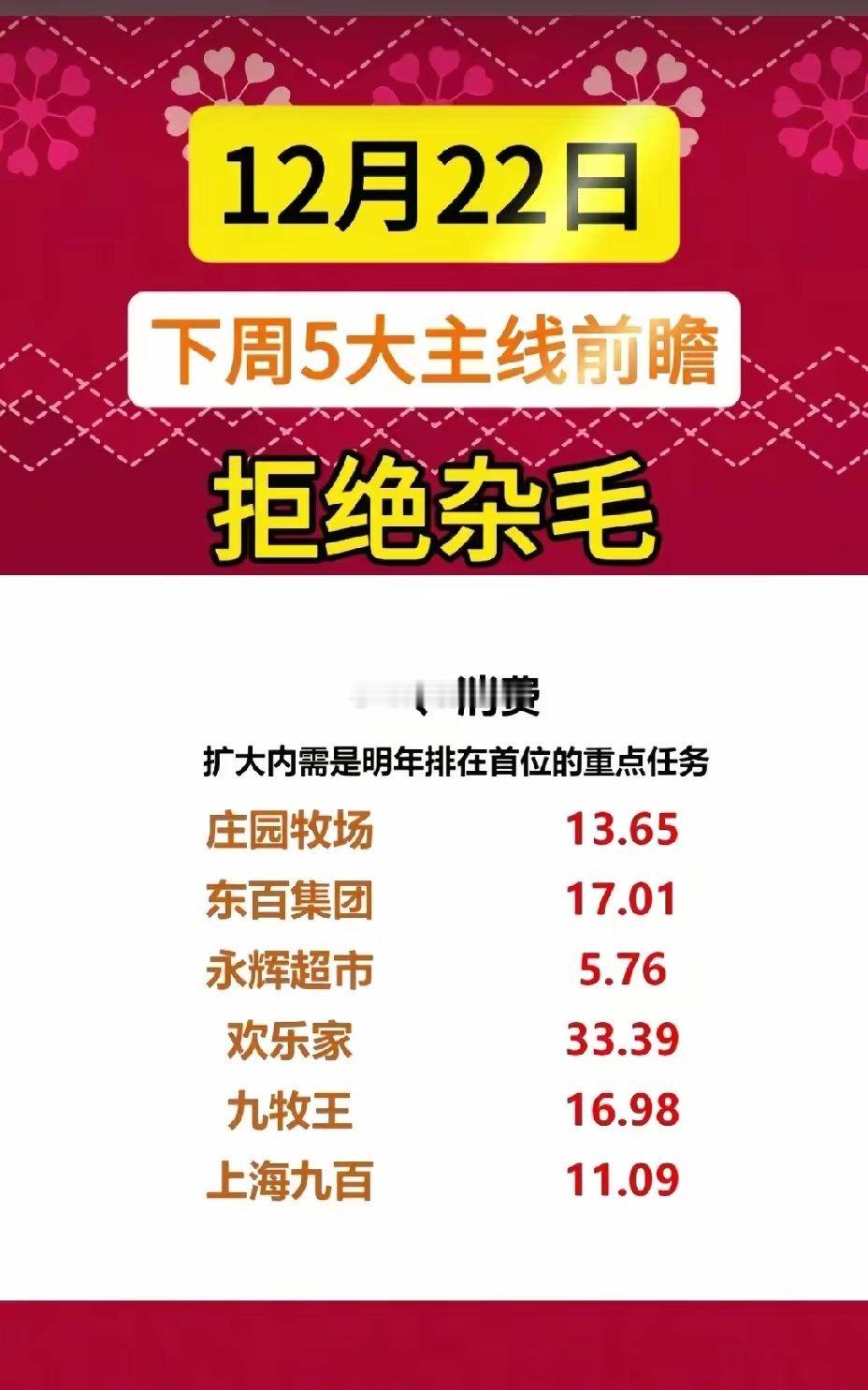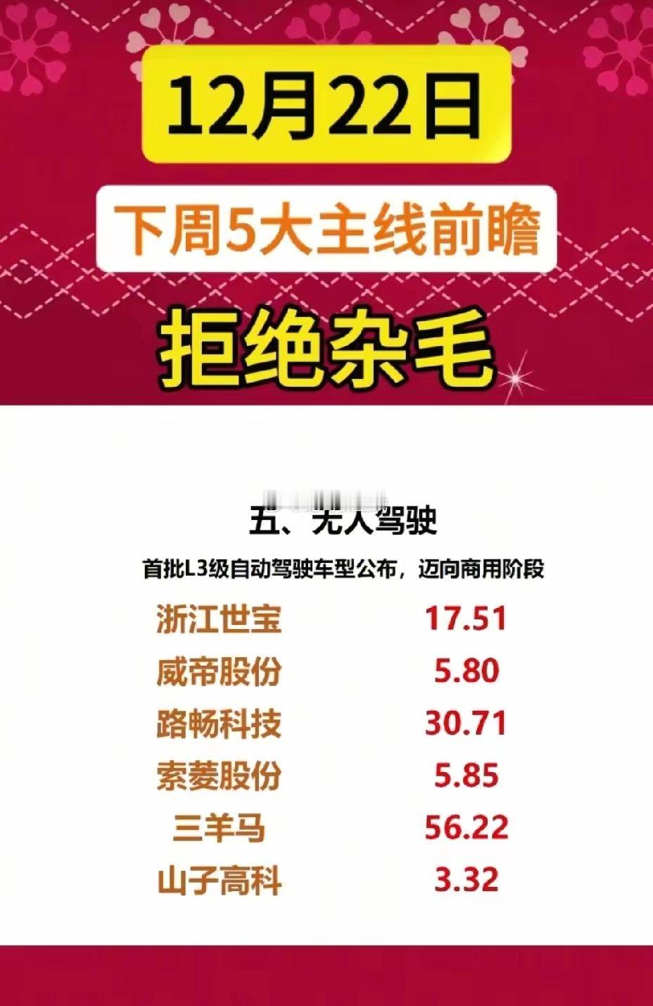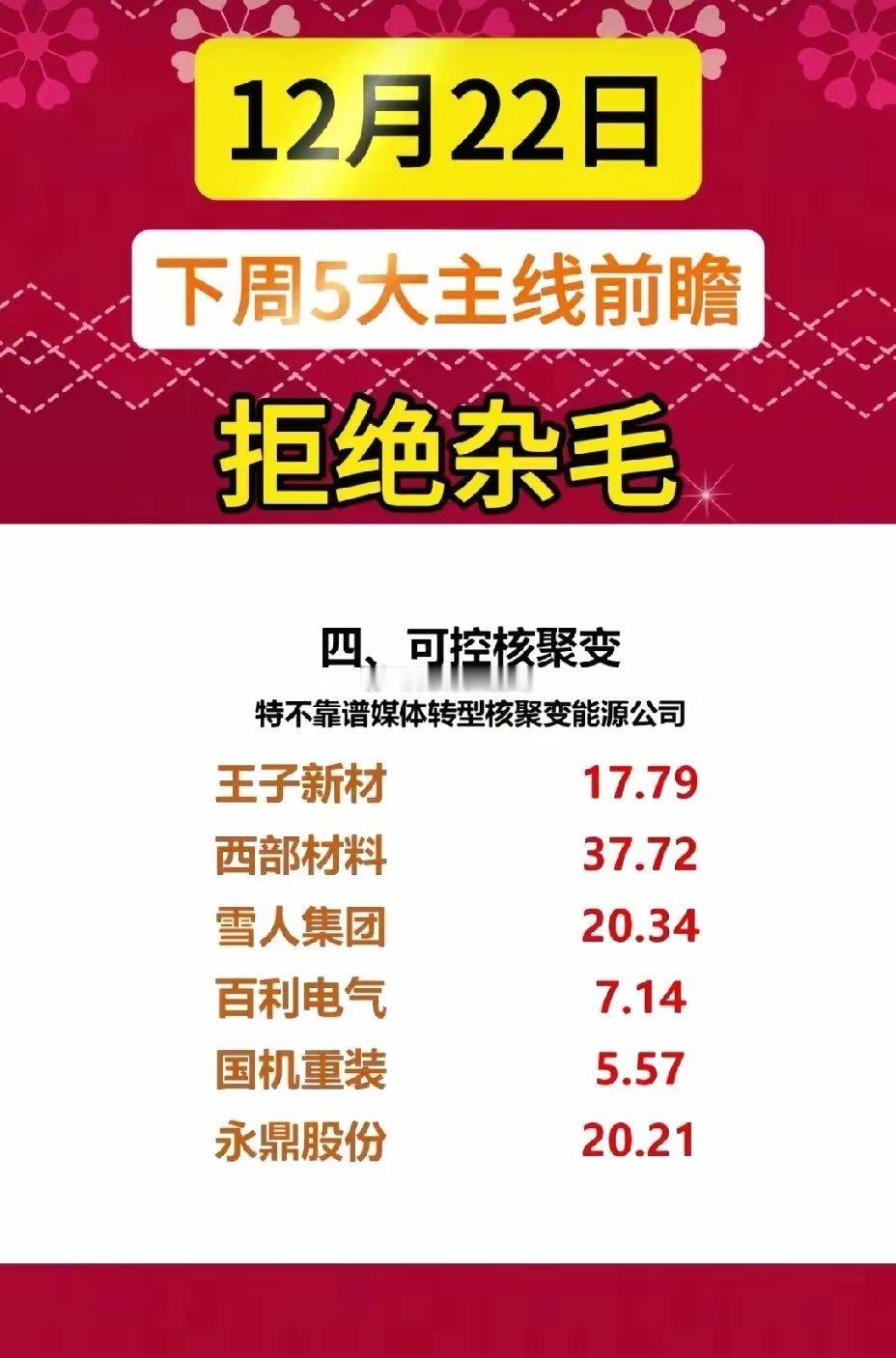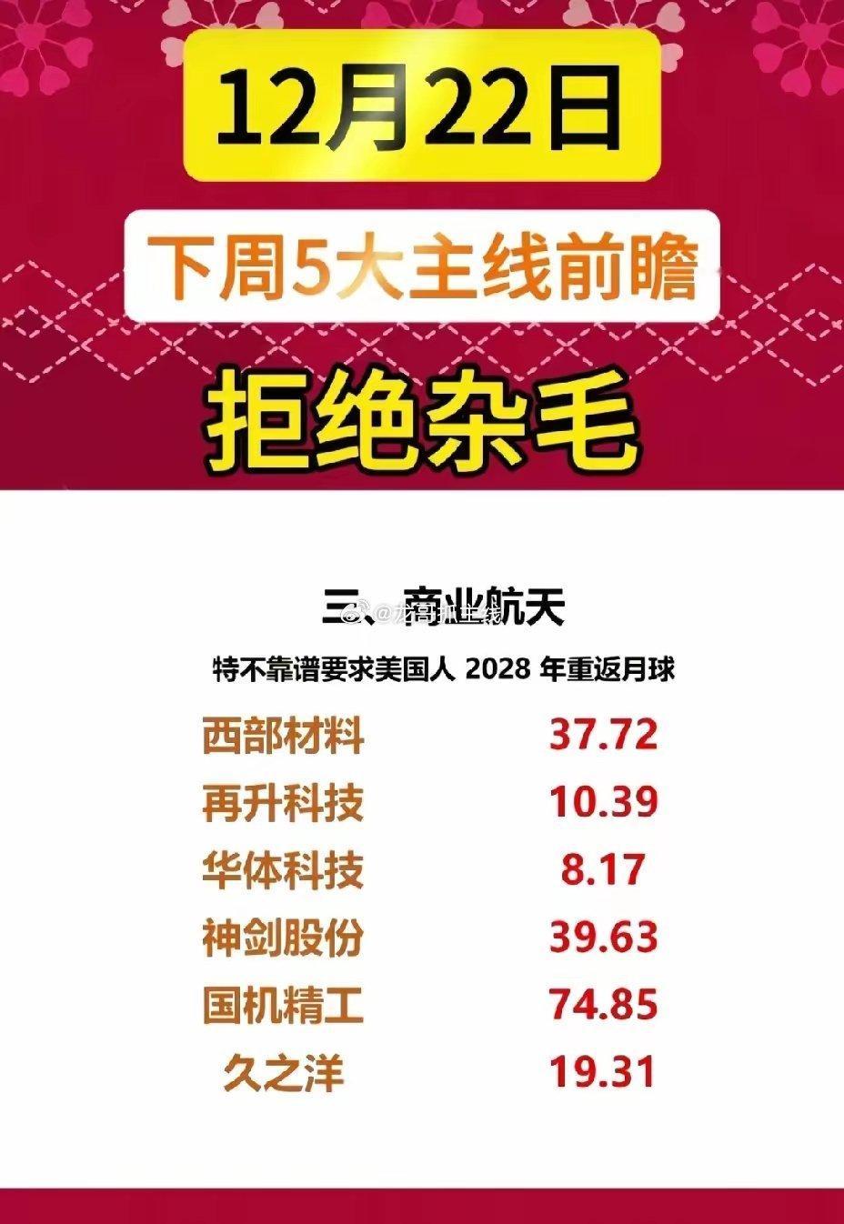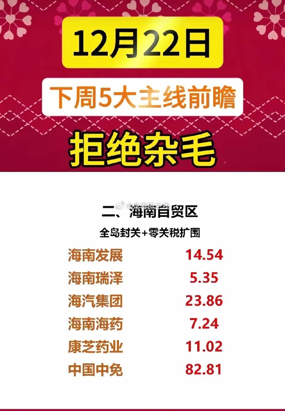 12月22日,下周一,A股这些板块有望大涨!!!消费零售板块:庄园牧场、欢乐家、九牧王;海南自贸区板块:海南润泽、海南发展、康芝药业;商业航天板块:久之洋、西部材料、再升科技;可控核聚变板块:王子新材、雪人集团、百利电气;无人驾驶:浙江世宝、三羊马、山子高科!!!股市分析