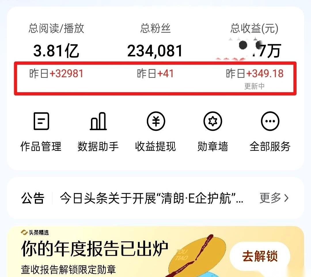 3万多阅读,到手349块。 好家伙,我当时手机差点没拿稳。掰着指头一算,千次单价奔着11块去了?我心说这是什么泼天富贵,轮到我了? 结果,点开收益明细的那一刻,我就知道自己又天真了。 一笔5块的激励,一笔166的活动奖金。 闹了半天,是人家平台发的“安慰奖”和“辛苦费”,凑了个大红包。 那心情,真跟坐过山机似的,嗖一下冲上云霄,pia叽一下又给摁回地面摩擦。 但你别说,这一下,反而给我干明白了。 咱们天天琢磨爆款,算计单价,觉得自己在跟算法斗智斗勇。其实平台比谁都精,它偶尔给你塞颗糖,不是因为你写得有多牛,而是想让你继续跑下去,别停。 它用这点小钱,钓着你的胃口,让你觉得有盼头。 说白了,就是让你“大胆试”。 很多人天天问,我该写什么?我没有方向啊? 写个屁!想那么多干嘛? 万事开头难,你先把目标定成“发出去就行”。今天写生活,明天写职场,后天骂骂老板(当然是匿名的),写多了,感觉自然就来了。路都是自己蹚出来的,不是规划出来的。 这行当,饿不死勤快人。 只要你还在扑腾,总有几粒米是给你准备的。