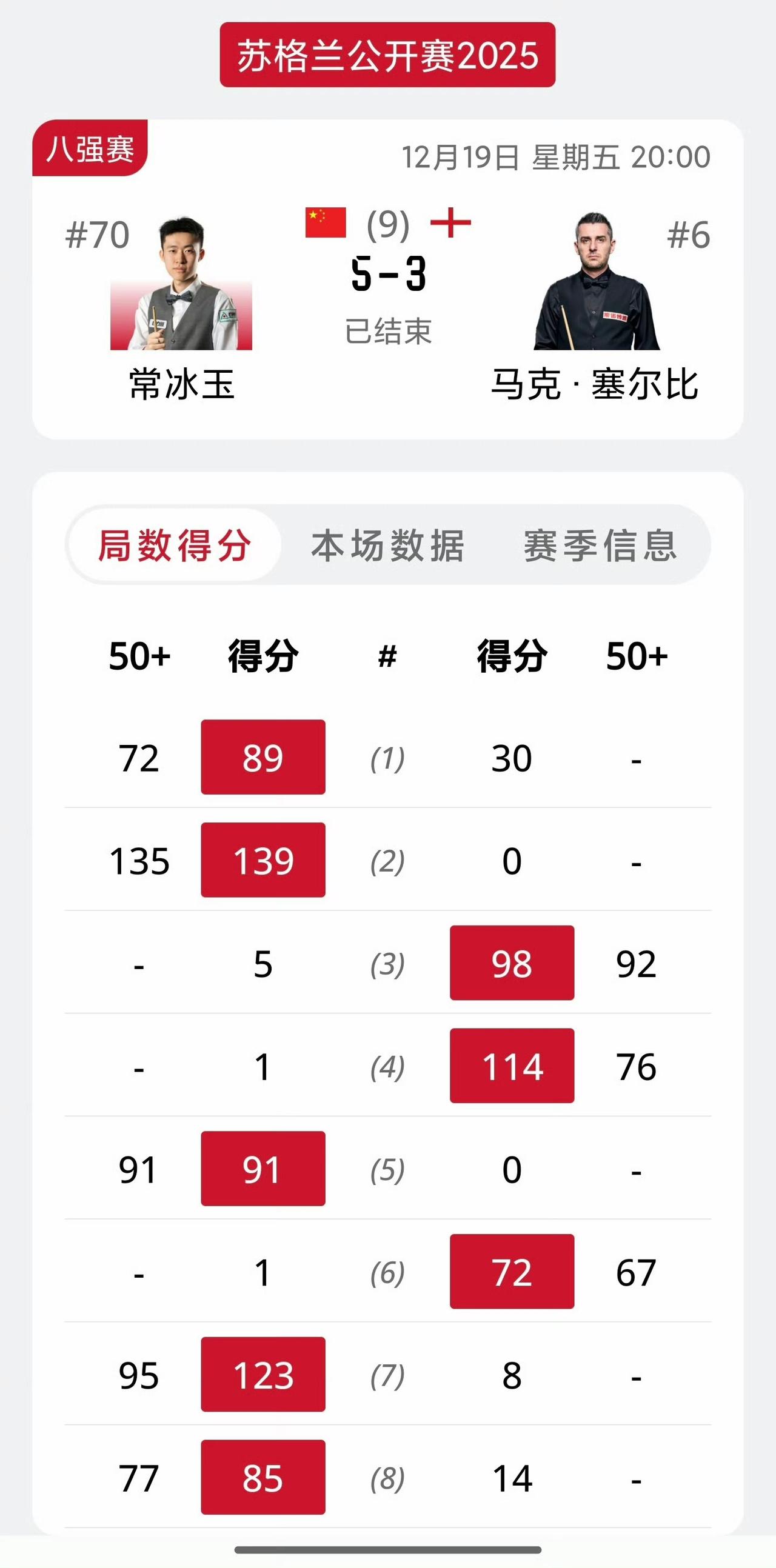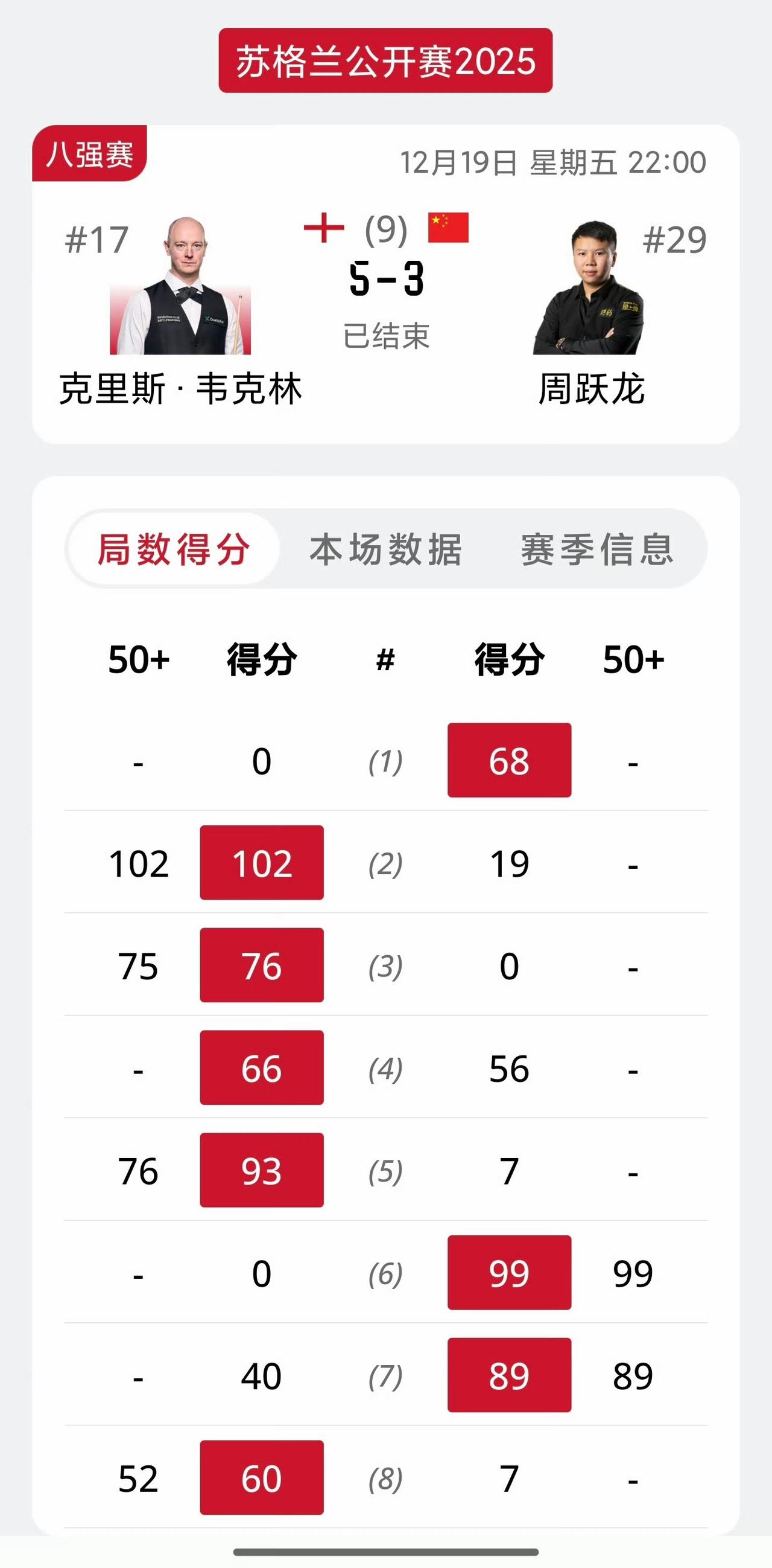连胜三位TOP16!常冰玉超神发挥5-3力克塞尔比晋级苏格兰公开赛四强!周跃龙连输四局不敌韦克林无缘四强! 1、常冰玉5-3塞尔比 本届比赛常冰玉一路连胜斯佳辉、威尔逊、塞尔比三位TOP16选手晋级四强,下一轮对阵艾伦和奥康纳之间的胜者,难道说又要产生一个新的冠军? 2、周跃龙3-5韦克林 周跃龙在先拿一局后连丢四局,1-4落后,随后他挽救两个赛点,最终仍然3-5不敌韦克林,无缘四强。