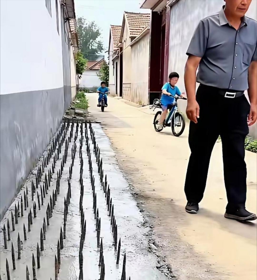 这个是农村的一个住户,怕别人车子碰到l|房子被路过的卡车给刮了,居然在墙的周边加上这么多的钢钎子,又高又尖有30厘米高,虽然是可以防车但是对行人和过往的车辆确实也不安全,况且墙外的道路也是公用的,何况也不是他家的地方,看这么干不是违法吗?