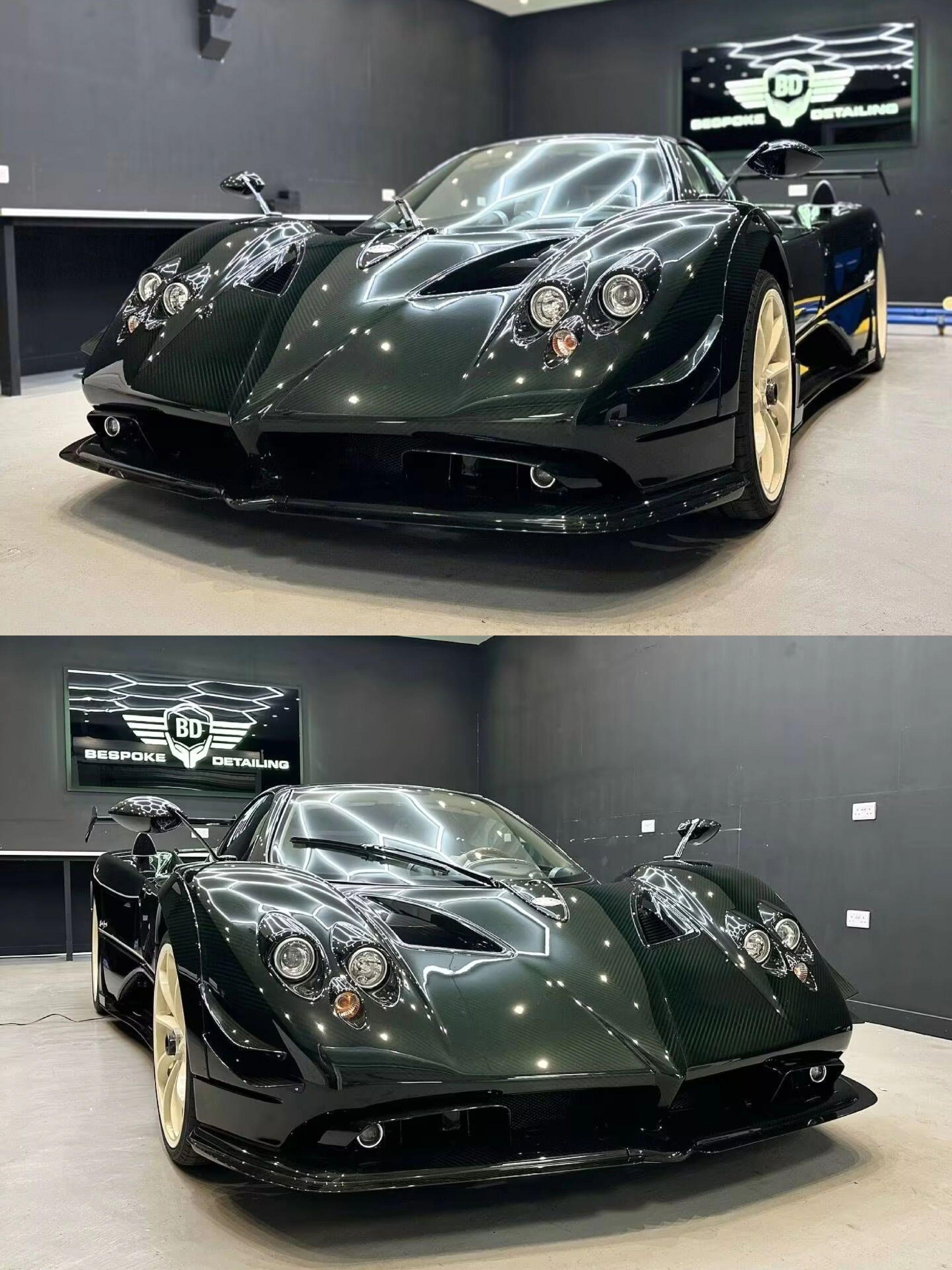 整车采用全新碳钛底盘按760制式打造,但并未选配LED日行灯,全车由定制绿色碳纤维包裹搭配碳纤维套件(类似Zonda R小型进气口、前轮拱、后视镜、车顶进气口、后风道进气口、Revo小尾翼以及Zonda By Mileson相同规格鲨鱼鳍定风翼和尾翼);定制Hermès 'H en Bi