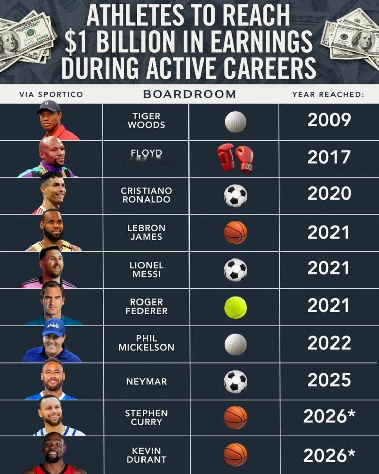 在役时,身家超10亿美元的运动员: 1、老虎伍兹——高尔夫(2009年突破10亿) 2、梅威瑟——拳击(2017) 3、C罗——足球(2020) 4、詹姆斯——篮球(2021) 5、梅西——足球(2021) 6、费德勒——网球(2021) 7、米克尔森——高尔夫(2022) 8、内马尔——足球(2025) (未退役时身价超10亿美元) 根据媒体计算,综合薪资、代言、商业投资,库里、杜兰特将在2026年加入10亿美元俱乐部, 届时,前10的运动员里,将有3个NBA球员,这刚好与足球持平。也展现出了如今NBA的商业影响力。且随着新转播合同的诞生,未来NBA的超级巨星在生涯中突破10亿美元将会变得容易一些,例如文班亚马,只要健康,几乎必破10亿,且用不了詹姆斯、杜兰特、库里这么长时间。
