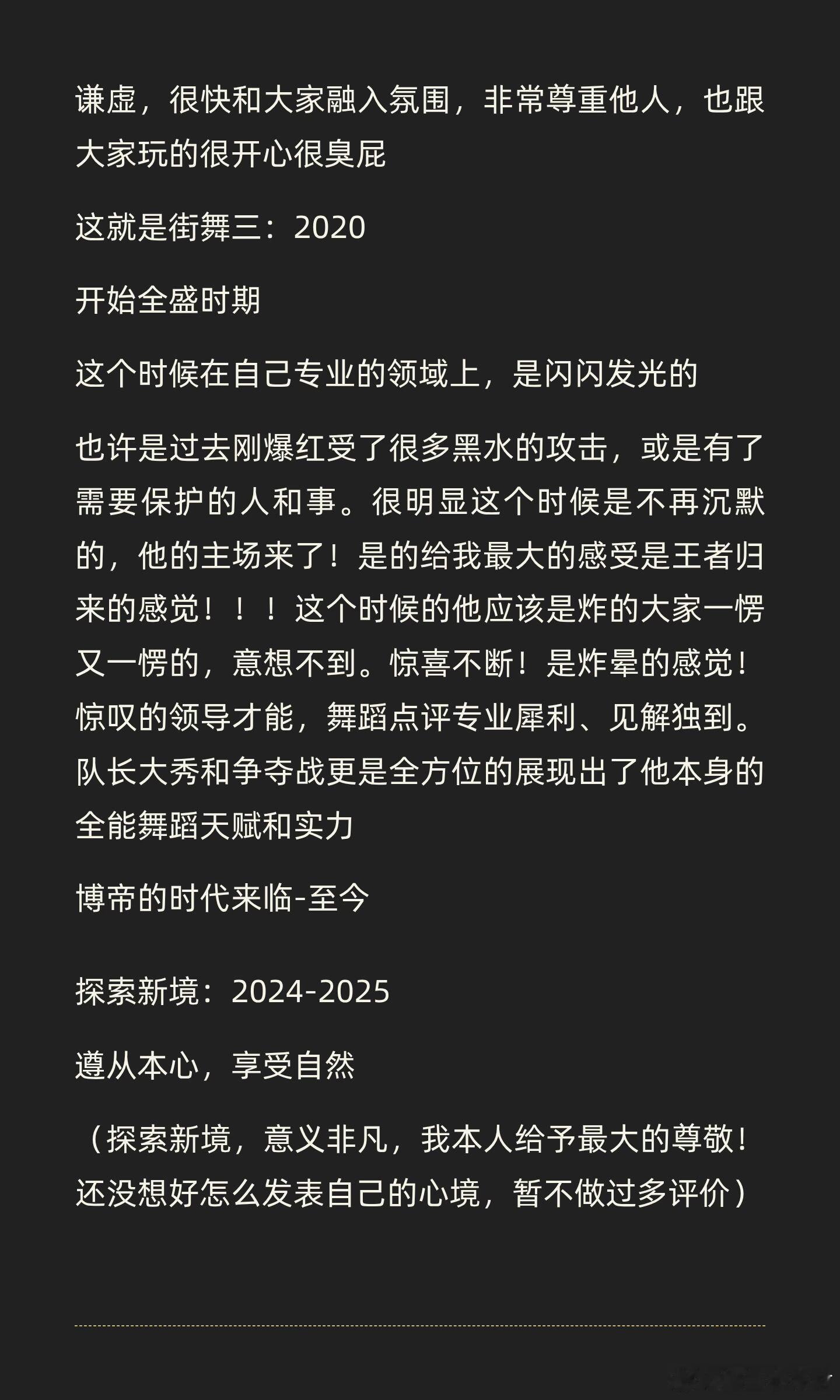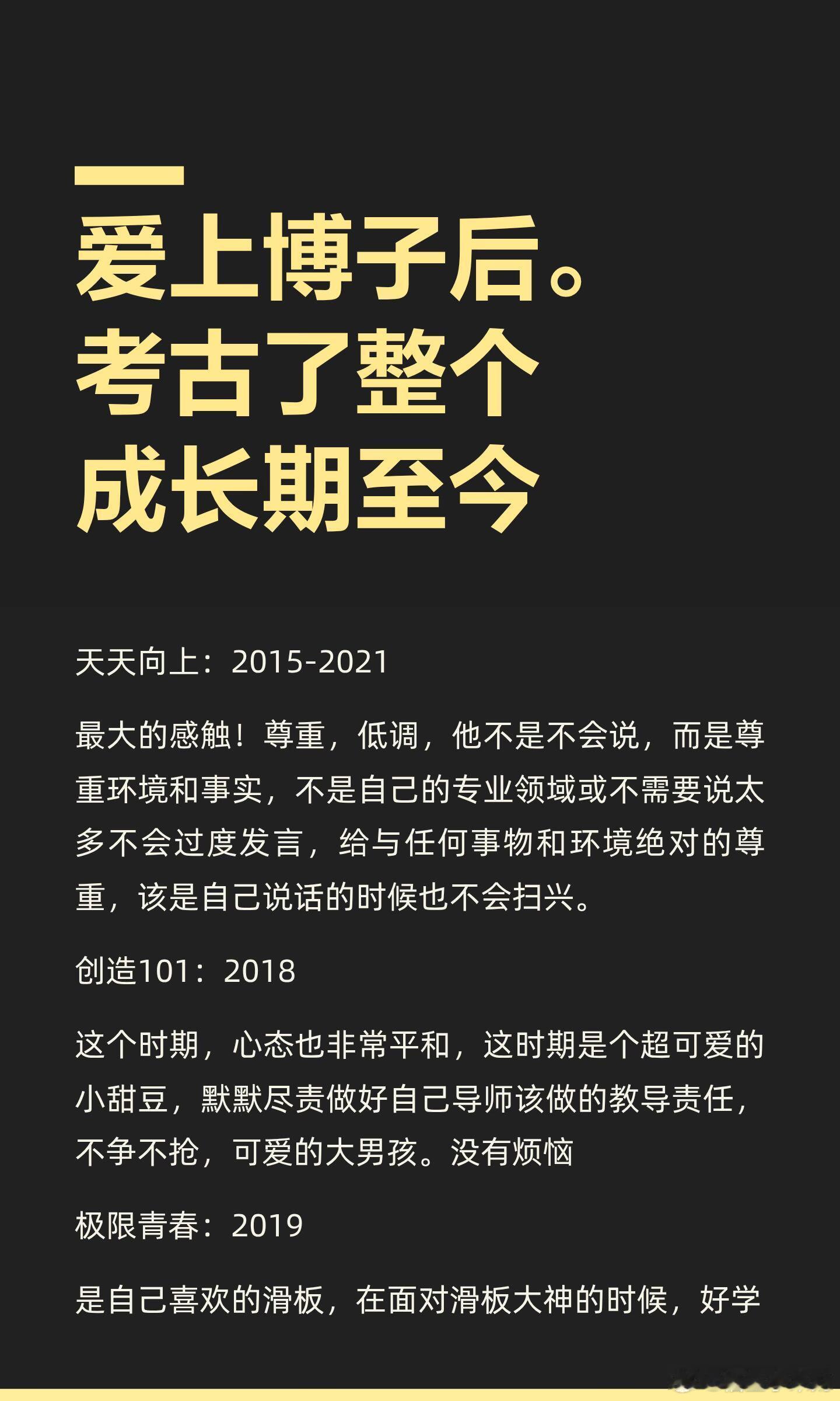 爱上王一博后。考古了整个成长期至今天天向上:2015-2021最大的感触!尊重,低调,他不是不会说,而是尊重环境和事实,不是自己的专业领域或不需要说太多不会过度发言,给与任何事物和环境绝对的尊重,该是自己说话的时候也不会扫兴。创造101:2018这个时期,心态也非常平和,这时期是个超可爱的小甜豆,默默尽责做好自己导师该做的教导责任,不争不抢,可爱的大男孩。没有烦恼极限青春:2019是自己喜欢的滑板,在面对滑板大神的时候,好学谦虚,很快和大家融入氛围,非常尊重他人,也跟大家玩的很开心很臭屁这就是街舞三:2020开始全盛时期这个时候在自己专业的领域上,是闪闪发光的也许是过去刚爆红受了很多黑水的攻击,或是有了需要保护的人和事。很明显这个时候是不再沉默的,他的主场来了!是的给我最大的感受是王者归来的感觉!!!这个时候的他应该是炸的大家一愣又一愣的,意想不到。惊喜不断!是炸晕的感觉!惊叹的领导才能,舞蹈点评专业犀利、见解独到。队长大秀和争夺战更是全方位的展现出了他本身的全能舞蹈天赋和实力博帝的时代来临-至今探索新境:2024-2025遵从本心,享受自然(探索新境,意义非凡,我本人给予最大的尊敬!还没想好怎么发表自己的心境,暂不做过多评价)我的追星成长记录