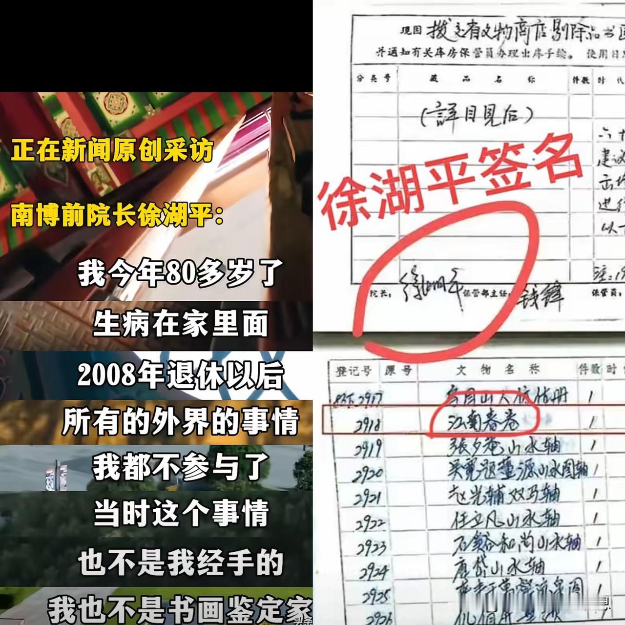南博事件最新进展,徐湖平称与南博事件无关,称自己82岁,身体欠佳,近20年未过问外界事务,不知道此事。 随即有网友指出,徐湖平1997年5月8日将《江南春》图卷交给江苏省文物总店时的签名清晰可见,当时他是南博院长及江苏省文物总店法人代表,怎么会不知情。 并且早在2012年就有南博职工实名举报徐湖平,之后就没下文了,这次是第二次曝光他。徐湖平辩称,那些书画从来没有经过他手,但署有他的名,且不说署名书画的奇怪情况,不知道他对本单位职工实名举报的事,作何解释?