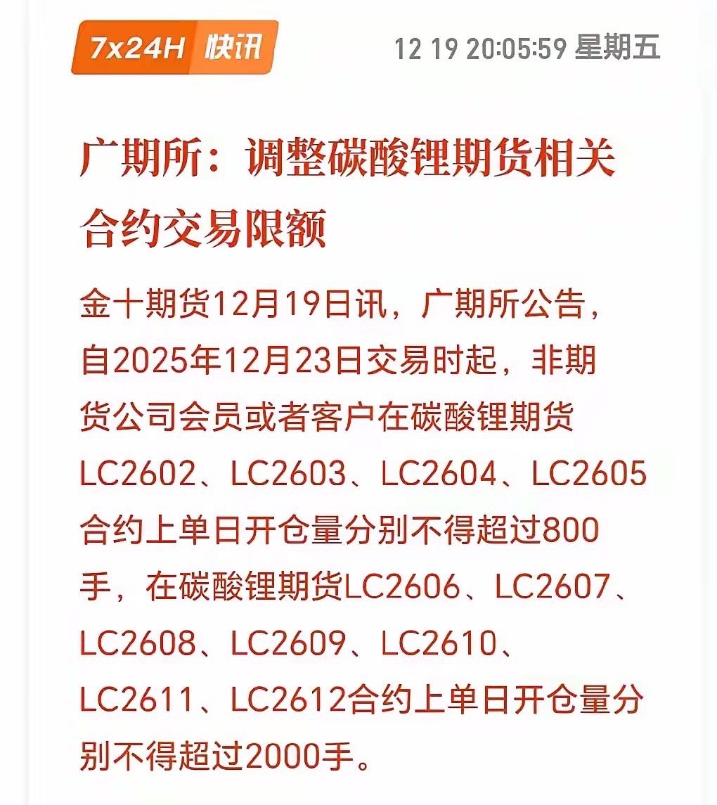 重磅:广期所出手,碳酸锂限仓了!最新消息,碳酸锂被限仓了。广期所,12月23日起,02-05限仓800手。06-12限仓2000手。多晶硅昨天也限仓了。铂和钯也限仓了。疯狂的炒作资金下一个目标:工业硅!唯一一个能继续炒的了。加油吧。