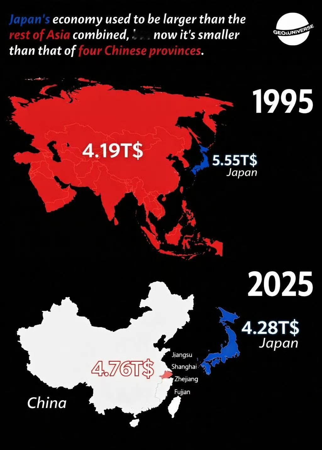 日本经济规模从几乎超越美国成为世界最大经济体,下降到甚至小于中国四个省份。