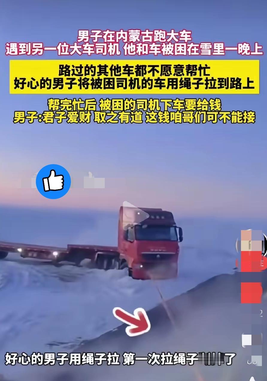 男子在内蒙古跑大车,半路上看到一部大货车困在雪地里,上前一问得知,该车司机和他的车子已经在雪地里困了一晚上了,当时的气温是零下20多度…… 零下20多度的内蒙古草原,真不是开玩笑的!长时间待在户外,冻伤、失温都是分分钟的事,搞不好还会危及生命。 跑大车的大哥遇到被困雪地里一整晚的同行,别人都绕着走,他却主动停下帮忙。第一次牵引绳都拉断了,换谁可能都打退堂鼓,可他没放弃,第二次硬是把车拽了出来。 被困司机掏 money 感谢,他一句“君子用钱取之有道”直接拒绝,这格局真的绝了!其实善良从不是必须做的事,却是寒冬里最暖的光,它能救命,更能照亮人心。 现在太多人怕惹麻烦选择冷漠,但这位大哥用行动证明,举手之劳就能给别人一条生路。如果你在路上遇到这种情况,会愿意停下来搭把手吗?
