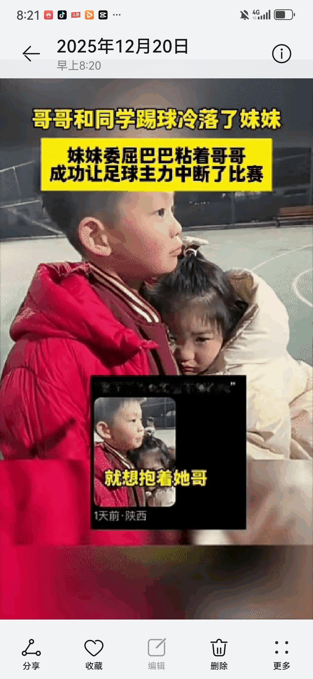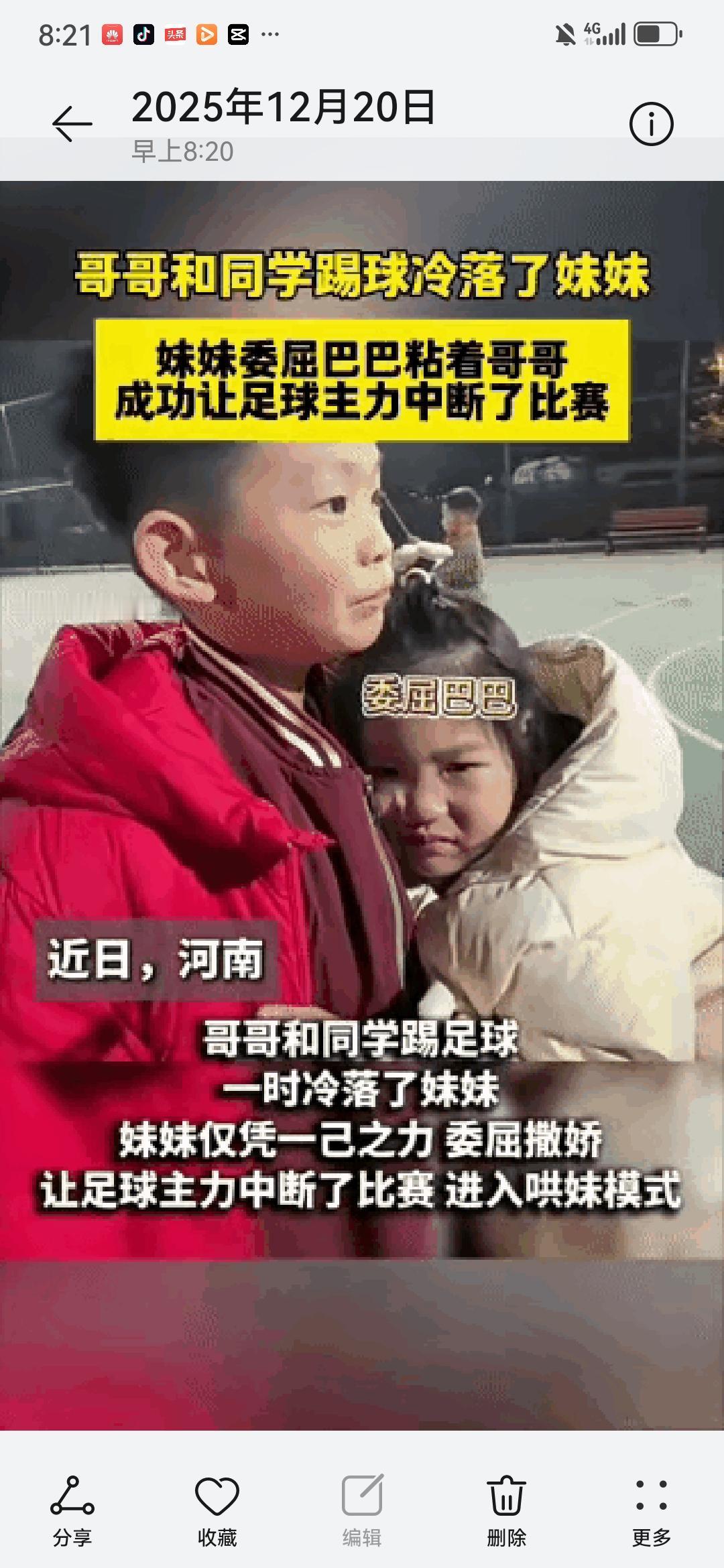 近日河南,哥哥正和同学在球场踢得热火朝天,完全没留意到一旁眼巴巴盯着他的妹妹。 河南这妹控哥哥也太好哭了吧!原来被偏爱的底气,真的藏在哥哥毫不犹豫的选择里~ 球场上正杀得尽兴的主力选手,瞥见妹妹委屈巴巴拽衣角的瞬间,立马停下比赛蹲下身哄。这份把妹妹放在第一位的偏爱,可比赢球珍贵多了。 很多人说兄妹是天生的羁绊,其实哪有什么理所当然,不过是有人心甘情愿把你的小情绪,看得比自己的快乐还重要。这种不掺杂质的守护,才是童年最暖的底色。 你家兄妹/姐弟有过这种“双向奔赴”的暖心瞬间吗?来评论区晒晒呀!