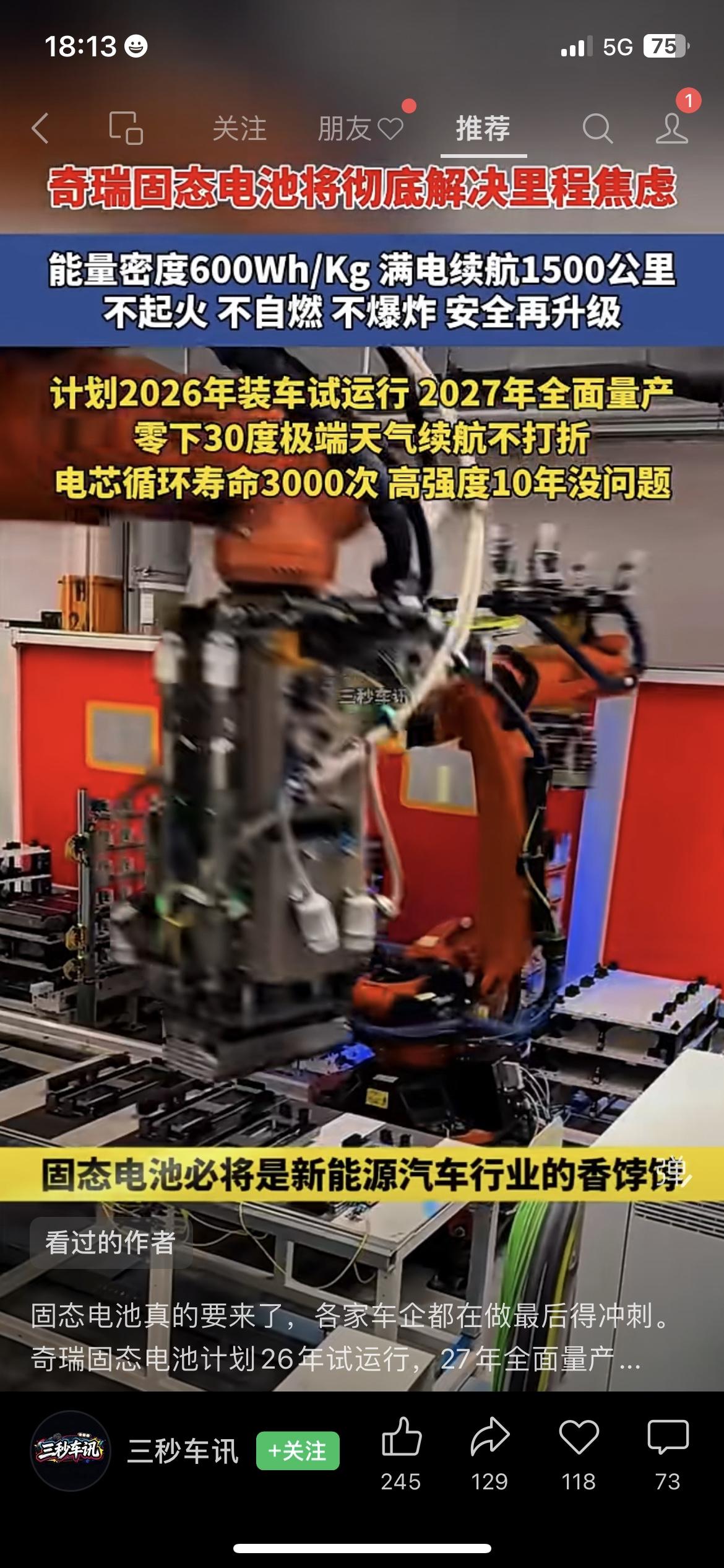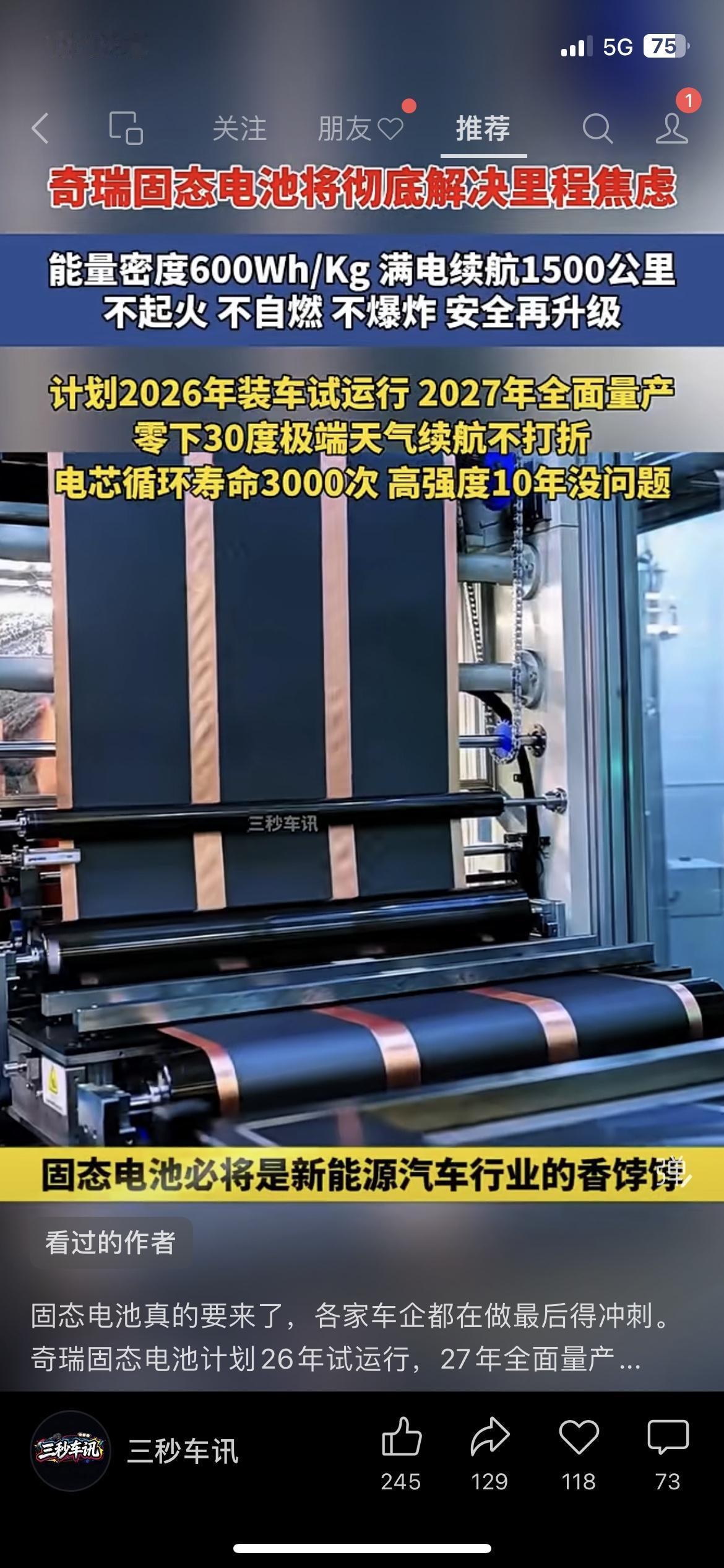 🚗奇瑞放大招!固态电池续航1500公里,零下30度也不虚 深圳网约车司机老陈拍桌:“跑长途再也不用找充电桩了” 2026年装车、2027年量产,电芯能用10年 新能源车主的终极焦虑,终于要被解决了? 你会等固态电池车再换车吗?奇瑞 国产全固态电池