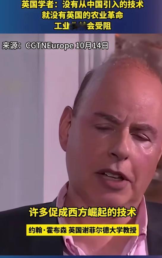 终于有西方的学者勇敢说真话了。 英国谢菲尔德大学教授约翰·霍布森在电视节目中说:“没有从中国引进的技术,就没有英国的农业革命,工业化就会受阻,西方人拿来了却说是西方人发明的。” 麻烦看官老爷们右上角点击一下“关注”,既方便您进行讨论和分享,又能给您带来不一样的参与感,感谢您的支持! 最近一段西方电视节目的片段火了,看完真让人觉得大快人心,终于有西方学者敢打破沉默说真话,把西方掩盖了几百年的历史真相给捅了出来,直接颠覆了很多人固有的认知。 英国谢菲尔德大学的约翰·霍布森教授,是位敢言的学者,他在节目中直言,若不是中国引进的技术,英国农业革命难成,工业化进程也会受阻,可西方却恬不知耻,将成果据为己有。 这话一出口,节目现场都安静了几秒,要知道在西方主导的历史叙事里,工业革命、农业革命一直被吹成他们的“原创功劳”,很少有人敢提背后的东方技术根源,霍布森这波操作属实是捅了马蜂窝。 从11到13世纪,陆上和海上丝绸之路空前繁荣,中国的先进农业技术就是顺着这些通道传到西方的,就说关键的曲辕犁,中国早在唐代就已经普及,这种犁能调节深浅,深耕浅耕都适用,比西方的直辕犁效率高3倍还多。 17世纪传入英国后,直接改变了当地的耕作模式,让耕地面积大幅提升,还有水利技术,中国的龙骨水车、筒车等灌溉工具,能在不同地形使用,解决了干旱地区的灌溉难题。 这些技术传到欧洲后,让英国的农田灌溉效率提升了近50%,为粮食增产打下了基础,除了耕作和灌溉技术,中国的作物种植技术也帮了英国大忙。 比如改良后的水稻种植技术、养蚕缫丝技术,还有高产作物的培育方法,让英国的农业产出在18世纪翻了一番,直接支撑了人口增长。 要知道农业革命是工业革命的前提,如果没有农业产出的提升,就没有多余的粮食养活城市人口,更没有劳动力转向工业生产。 霍布森教授说得没错,中国技术就是英国工业革命的“敲门砖”,可西方却刻意抹去了这段历史,把这些技术说成是自己的发明。 就像之前西方一直标榜的“三大发明”,其实都是源自中国,只是经阿拉伯人传播到西方后,被他们包装成了自己的成就。 英国哲学家弗兰西斯·培根就曾说过,印刷术、火药、指南针改变了整个世界的面貌,却压根没提这些发明来自中国,这种“拿来主义”加“冒领功劳”的操作,在西方历史叙事里并不少见。 霍布森教授之所以敢说真话,是因为他深耕东西方文明交流史多年,翻阅了大量一手史料,他在自己的著作里还提到,11到13世纪的欧亚交流,让西方快速追赶了东方文明的发展步伐。 其实不只是农业技术,中国的造纸术、印刷术传入西方后,打破了教会对知识的垄断,让书籍得以普及,火药技术改变了战争模式,直接推动了西方军事工业的发展,这些都是有史料可查的。 可长期以来,西方一直掌握着历史叙事的话语权,刻意淡化东方文明的贡献,甚至抹黑中国,霍布森教授的表态,相当于在西方的历史叙事墙上凿开了一个口子,让真相有了传播的机会。 历史真相或许会被掩盖,但绝不会被永远埋没,我们既要了解自己的文明成就,也要客观看待不同文明的交流互鉴,更要学会用史实说话,打破那些被扭曲的历史叙事。 文明的发展从来不是孤立的,东西方文明的交流互鉴才推动了人类的进步,霍布森教授的真话,不仅还原了历史真相,也让我们明白,真正的自信是正视历史、尊重真相,这才是对待文明的正确态度。 信源:光明日报《11—13世纪中国与印度科技知识向西欧社会的传播》、华中师范大学中国农村研究院《告别饥荒:近代早期英国的农业革命》