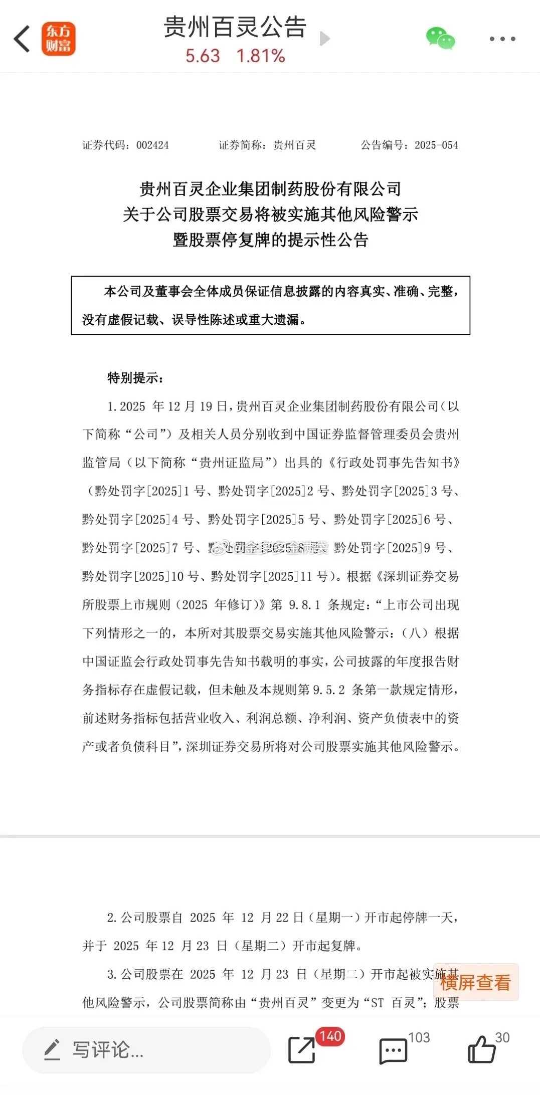 贵州百灵又被ST了!公司涉嫌定期报告财务数据存在虚假记载,2019年至2021年期间少计销售费用,累计虚增利润6.55亿元,2023年多计销售费用,虚减利润4.59亿元。公司股票将被实施其他风险警示,下周一停牌一天,下周二复牌股票名称变更为“ST百灵”。贵州百灵去年5月份刚被ST,经过一年的整改,今年6月底才刚刚摘帽,没想到这才半年时间又被ST了,持仓股民都要吐血了!这是不打算要公司了吗?
